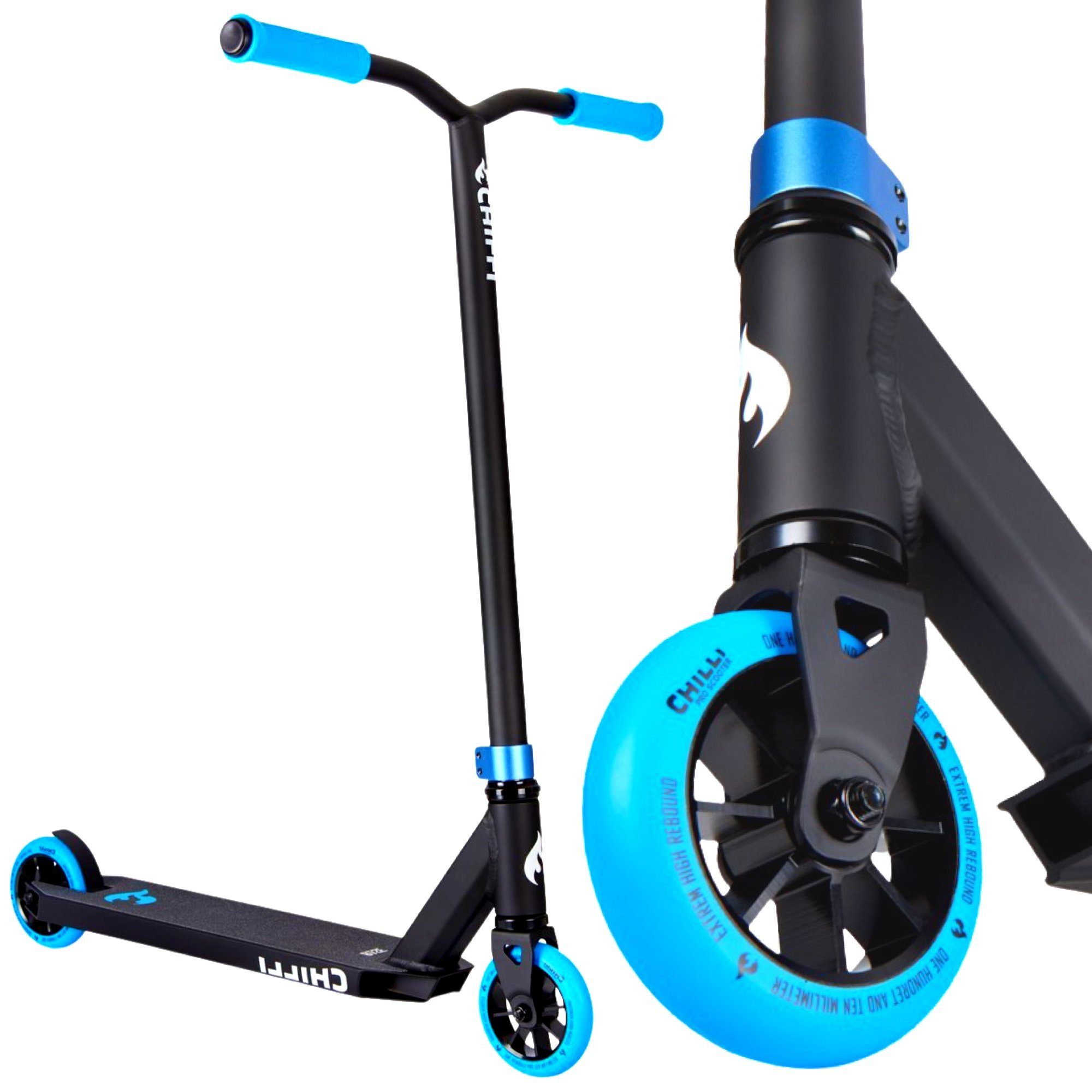 Das neue Chilli Pro Scooter Modell BASE ist der Einsteiger Stunt Scooter für jeden Beginner. In diesem Preissegment unschlagbar, man bekommt die besten Materialien und kann direkt auch auf die Rampe. Der Base bietet jedem die Möglichkeit das Stuntscooter fahren auszuprobieren, ohne auf Qualität verzichten zu müssen. Das Deck ist aus bestem 6061 Aluminium, 50cm lang und 11,5 breit. Dadurch hat man genug Platz um sich auf dem Deck zu bewegen und einen festen Stand zu haben. Die Lenkstange ist gefertigt aus 4130 ChrMo Stahl und 58cm hoch und 58cm breit. Die schöne Stahlgabel rundet das klassische Design des Scooters ab. Zur Kompression verwenden wir bei diesem Modell ein universal HIC um Gewicht zu sparen. Das rundet auch die schöne HIC Aluminium 2 bolt Klemme ab. Als Steuerlager werden sealed loose ball Kugellager verwendet. Ansprechend ist auch die farbliche Abstimmung der Griffe mit dem Rollen PU. Die Rollen selber sind 110mm im Durchmesser und der Rollencore besteht ebenfalls aus bestem 6061 Aluminium. Die flex Bremse besteht aus Stahl und wird von oben montiert.