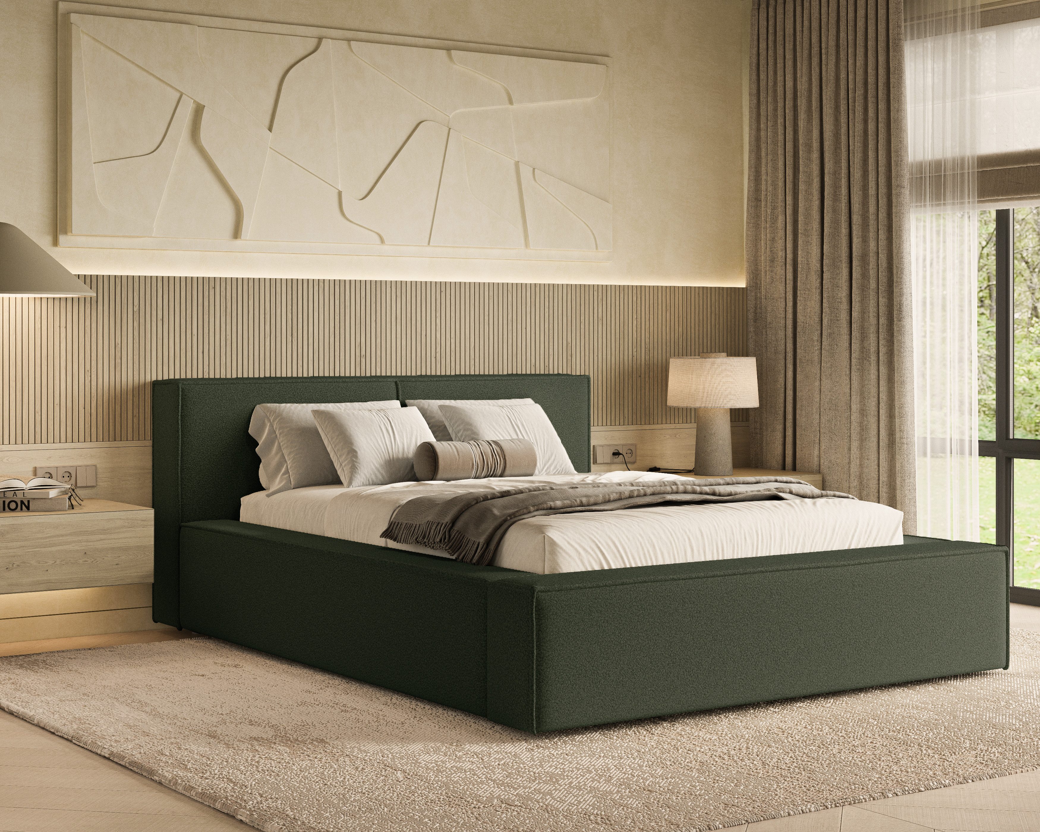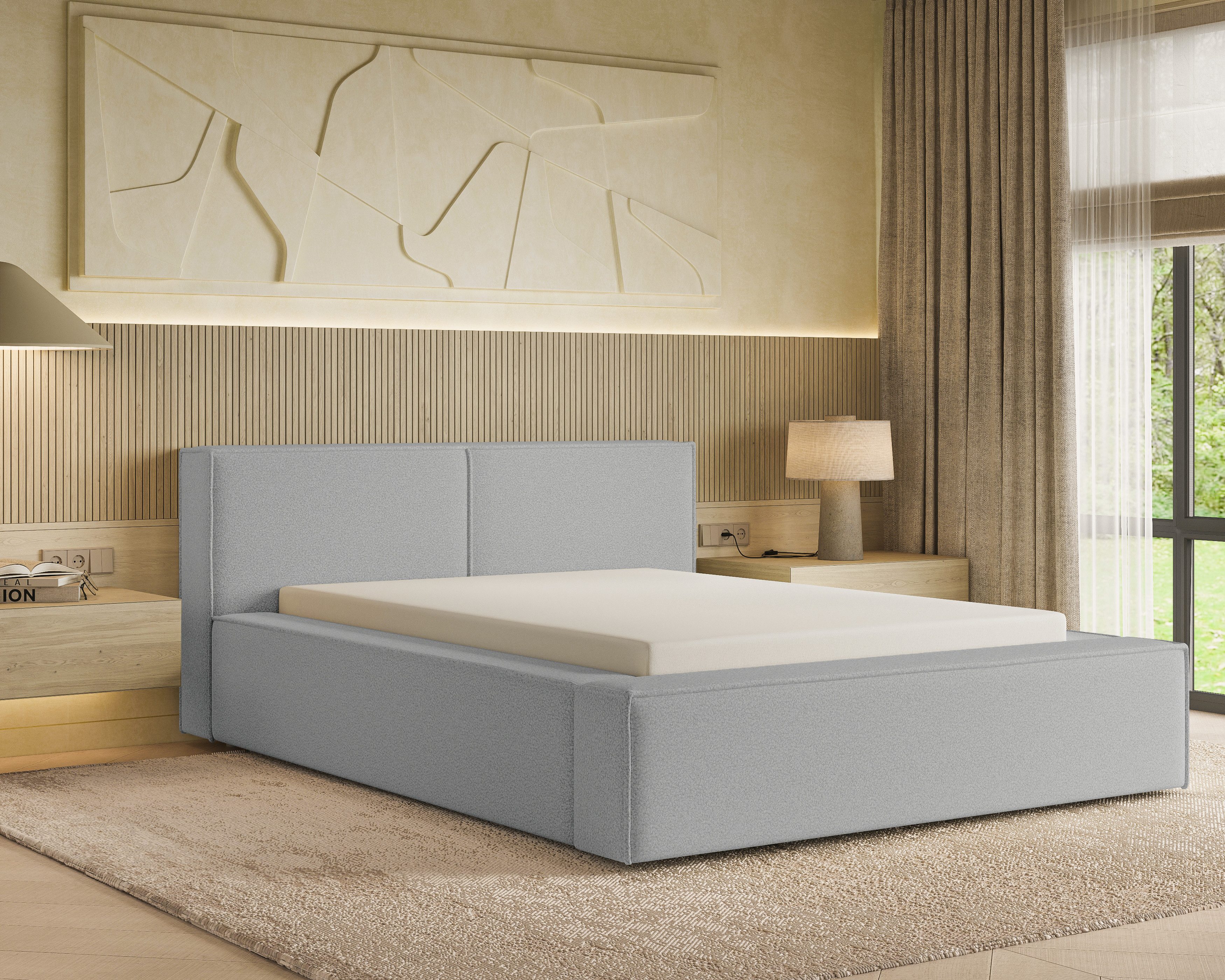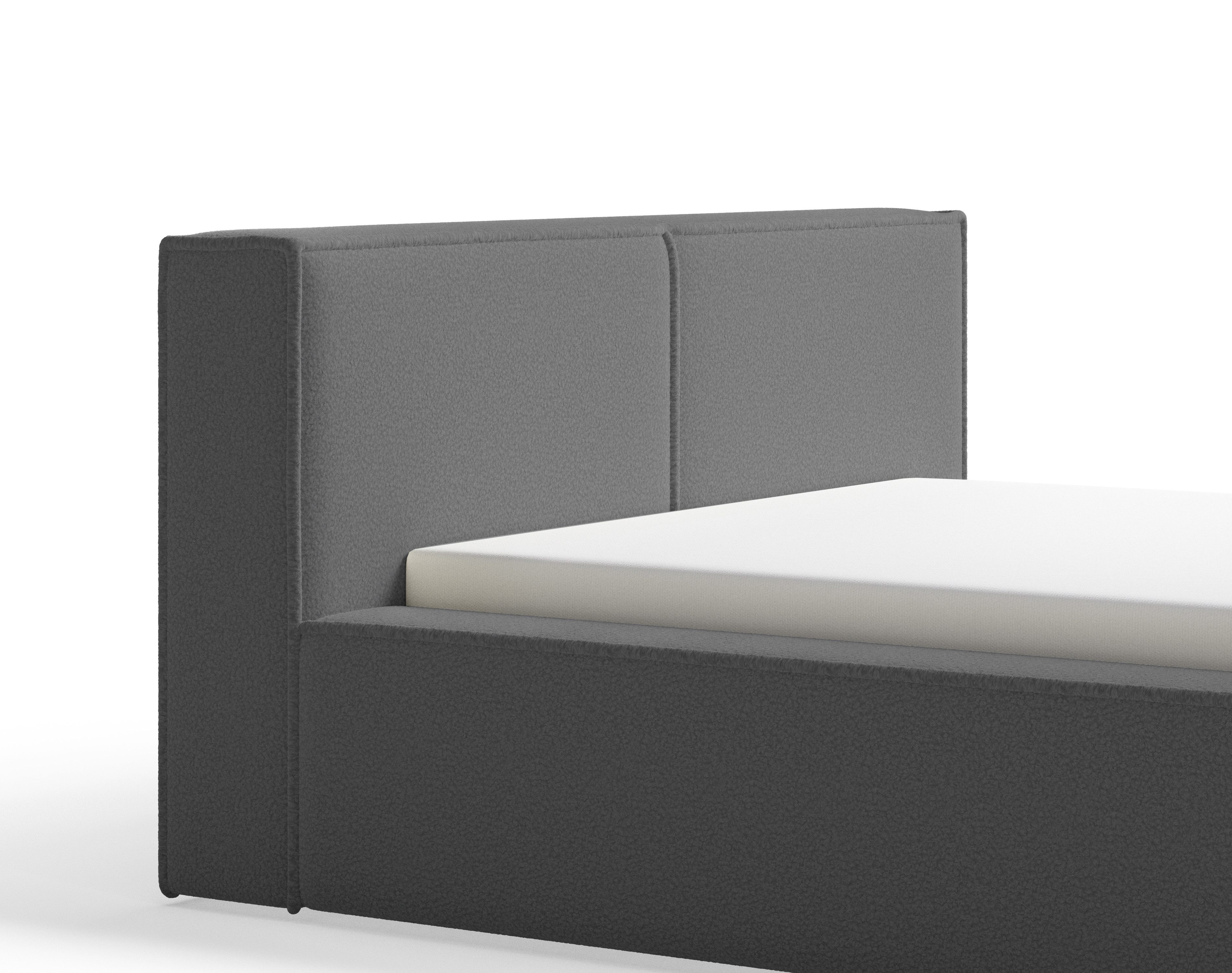 Das Polsterbett Lugano Bouclé mit Stauraum verbindet modernes Design mit praktischer Funktionalität. Die elegante, gepolsterte Oberfläche verleiht dem Bett zeitlose Eleganz und schafft eine gemütliche Atmosphäre im Schlafzimmer. Dank stabiler Konstruktion und hochwertiger Verarbeitung überzeugt das Bett durch Langlebigkeit, Komfort und stilvolle Ausstrahlung – ideal für verschiedene Einrichtungsstile.