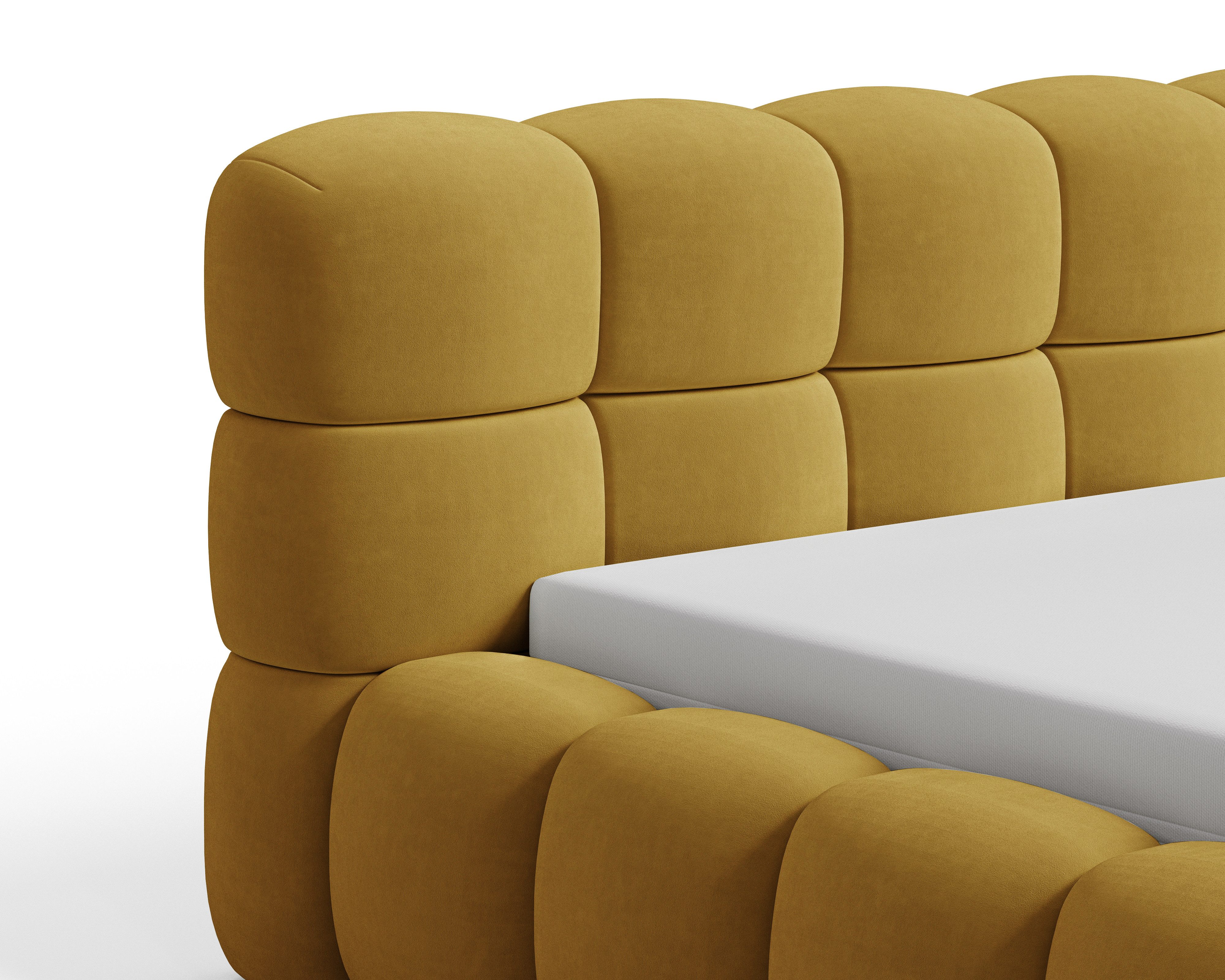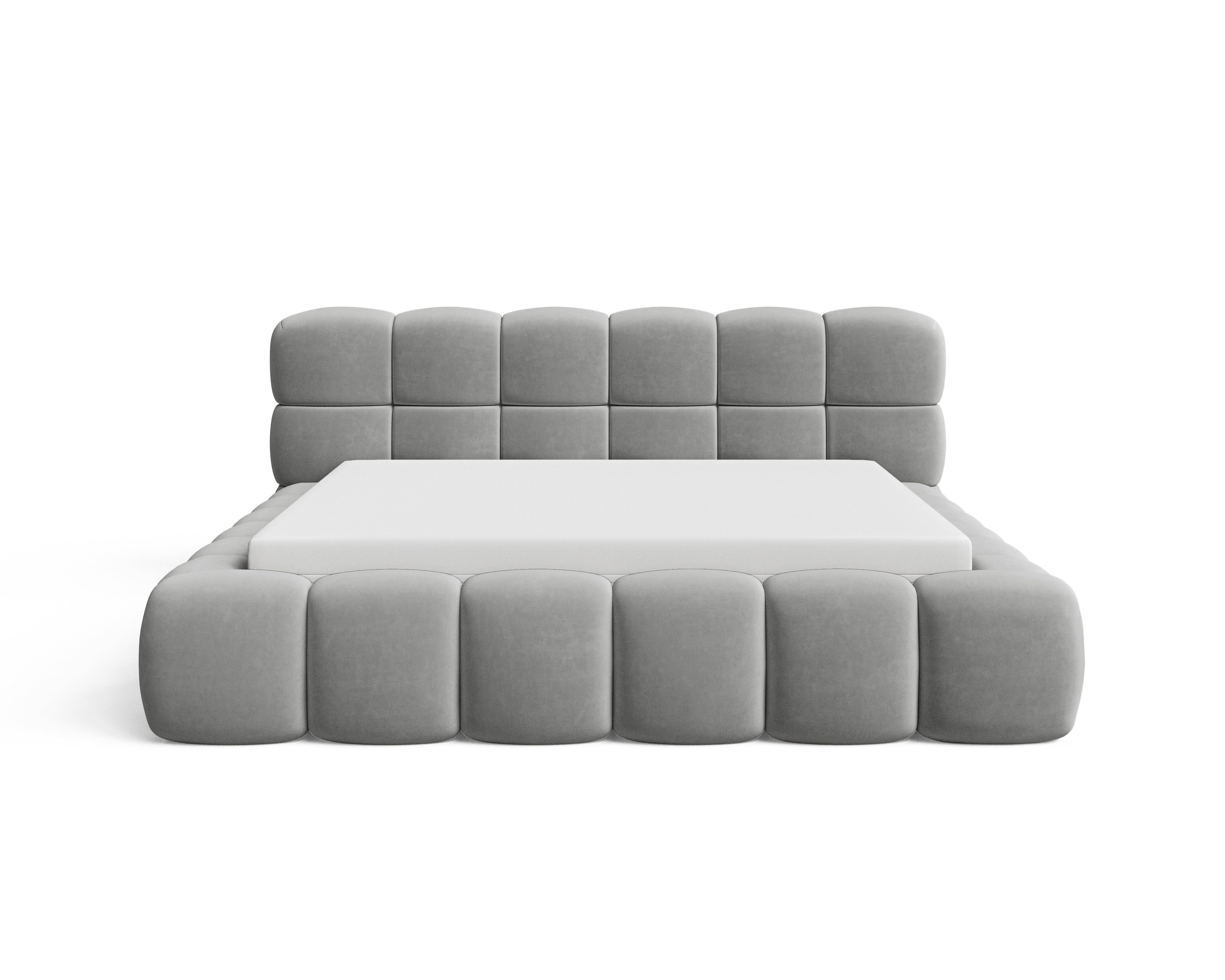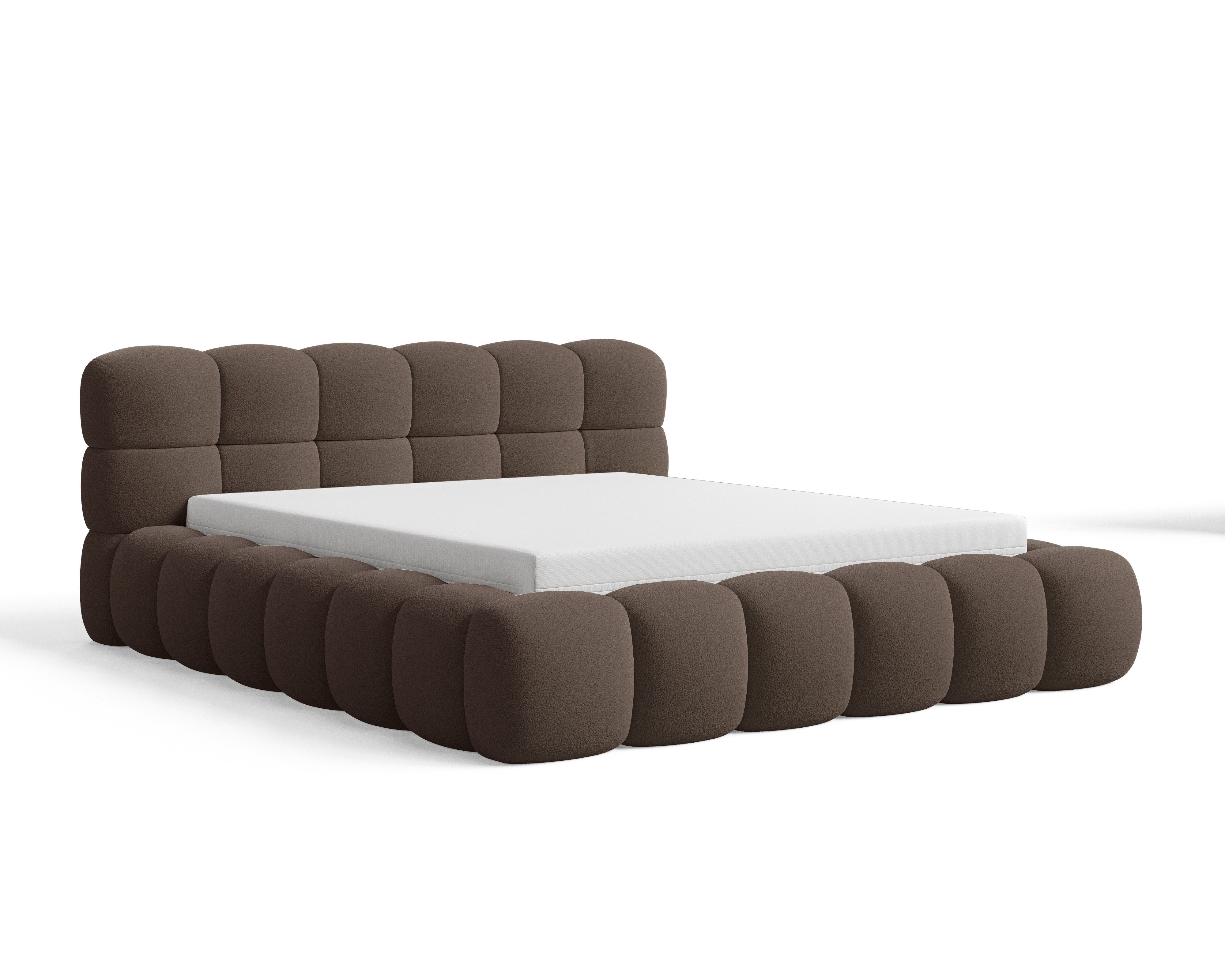 Das Polsterbett Stone Bouclé mit Bettkasten verbindet modernen Stil, klare Linien und praktische Funktionalität. Die gepolsterte Oberfläche im trendigen Blockmuster verleiht dem Bett einen einzigartigen Charakter und bringt Eleganz im luxuriösen Stil in Ihr Schlafzimmer. Dank der Kombination aus solider Konstruktion und hoher Verarbeitungsqualität überzeugt das Bett sowohl optisch als auch im täglichen Gebrauch.
