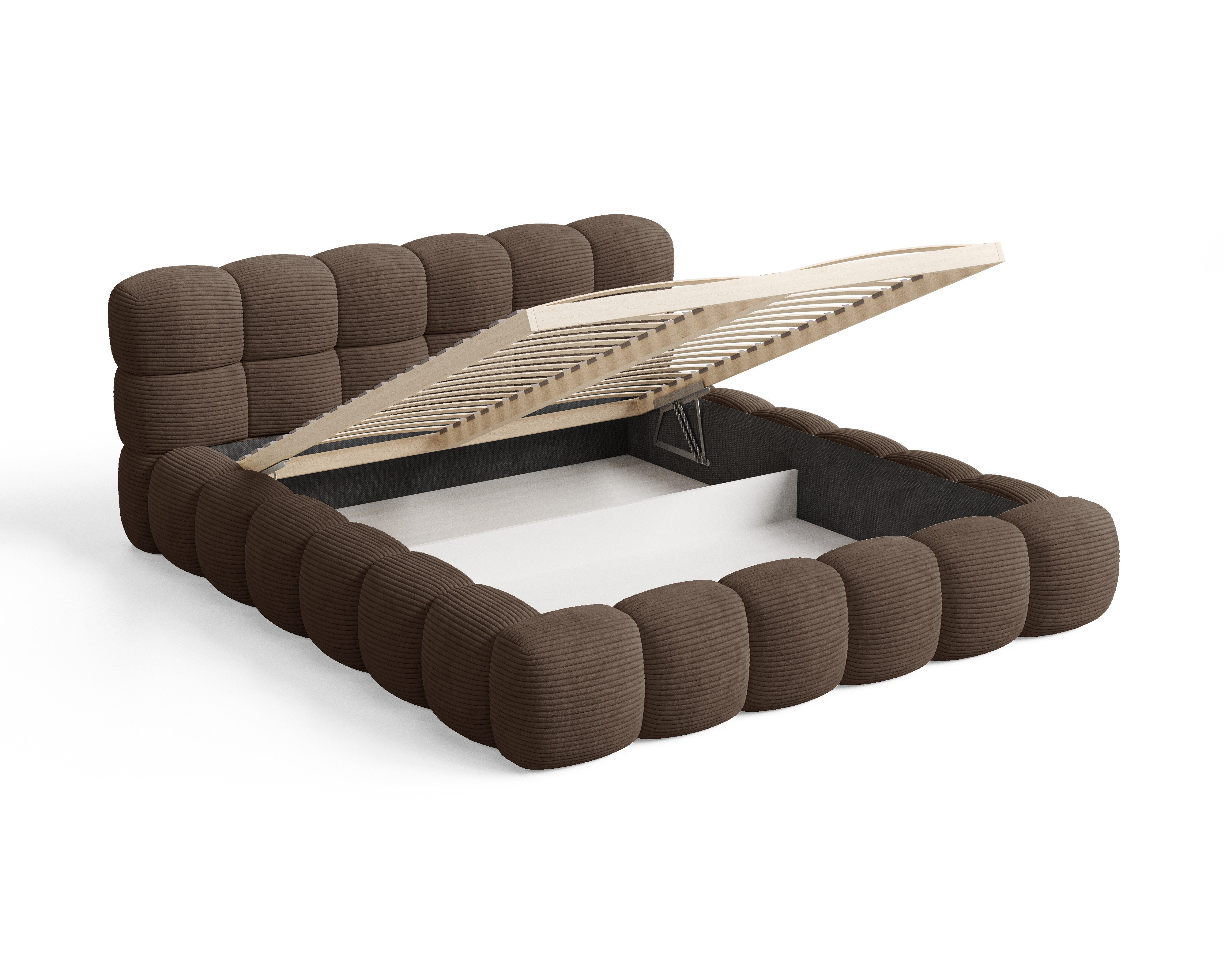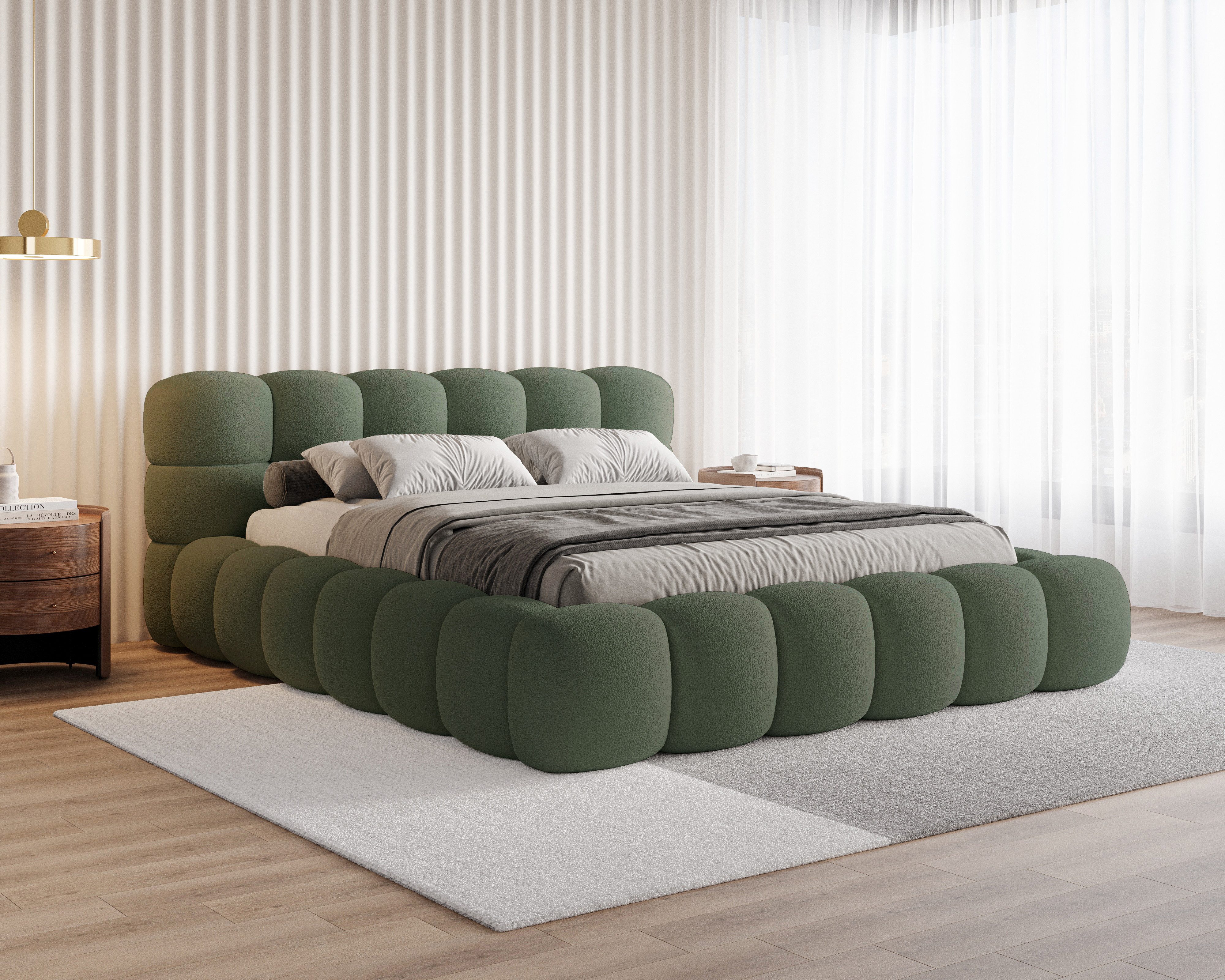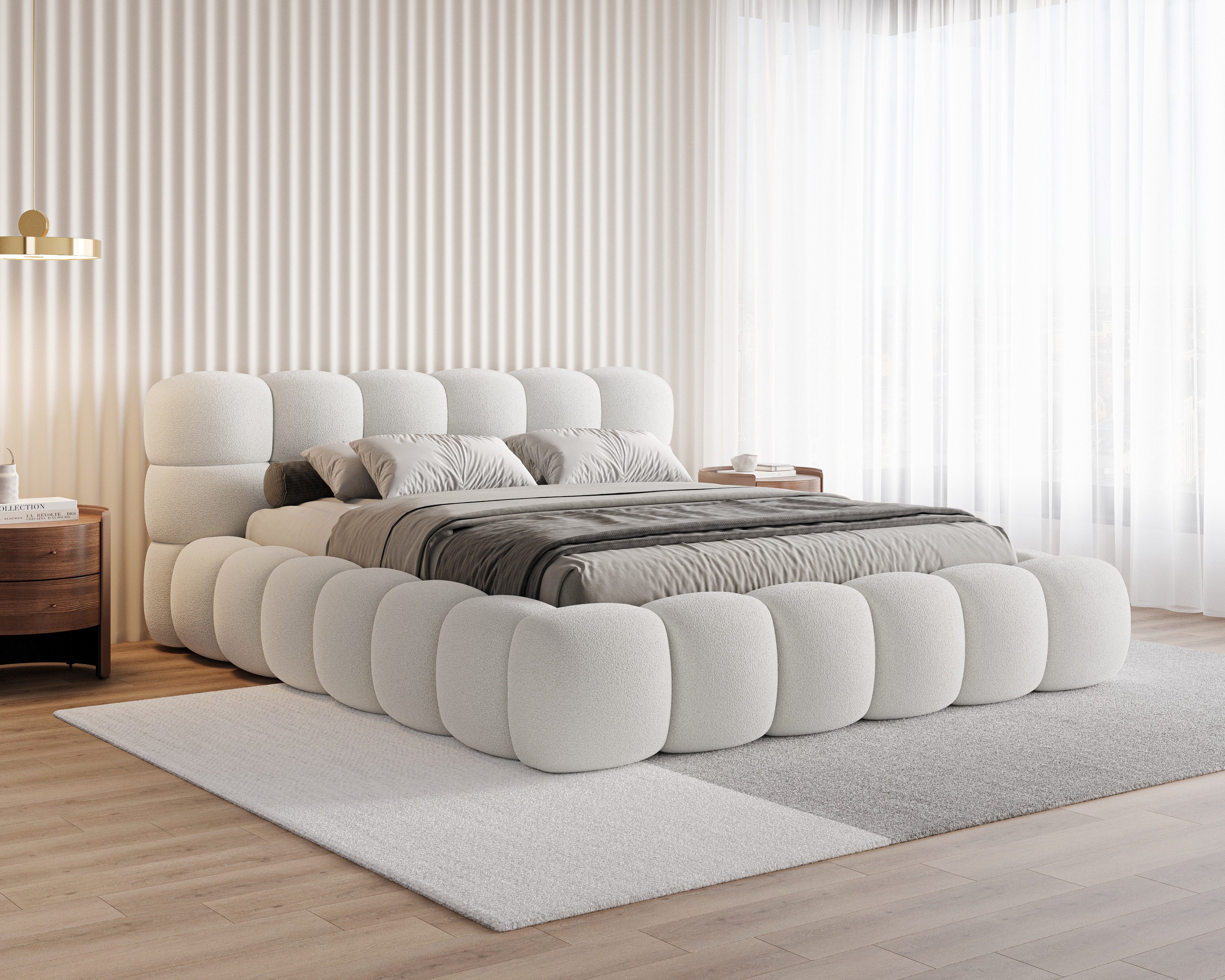 Das Polsterbett Stone Bouclé mit Bettkasten verbindet modernen Stil, klare Linien und praktische Funktionalität. Die gepolsterte Oberfläche im trendigen Blockmuster verleiht dem Bett einen einzigartigen Charakter und bringt Eleganz im luxuriösen Stil in Ihr Schlafzimmer. Dank der Kombination aus solider Konstruktion und hoher Verarbeitungsqualität überzeugt das Bett sowohl optisch als auch im täglichen Gebrauch.