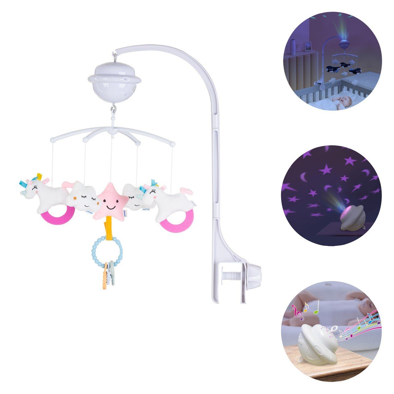 Das Musikmobile mit Bluetooth-Funktion von Chipolino wird Sie mit seinen vielen Funktionen überzeugen. Dank der Universalklemme lässt es sich problemlos am Babybett oder Laufstall befestigen. Die sanften Melodien der Spieluhr werden Ihr Kind in den Schlaf begleiten. Außerdem verfügt das Musikmobile über eine Bluetooth-Funktion. Diese ermöglicht Ihnen, das Mobile mit einem Gerät zu verbinden, um die Lieblingsmusik- oder Geräusche Ihres Babys abzuspielen. Der Projektor projiziert den Mond und die Sterne in verschiedenen Farben an die Zimmerdecke und beruhigt Ihr Baby zusätzlich zur Musik.