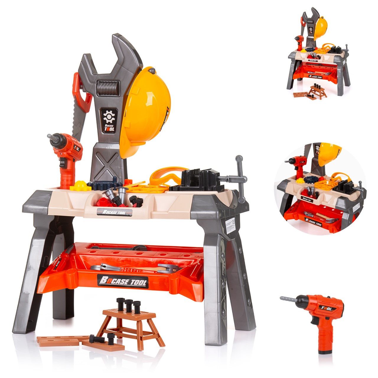 Lieferumfang | Kinderwerkbank, Säge, Schraubenzieher, Hammer, Schraubenschlüssel, Zange, Helm, elektrischer Bohrer, verschiedene Schrauben, Schutzbrille uvm. |