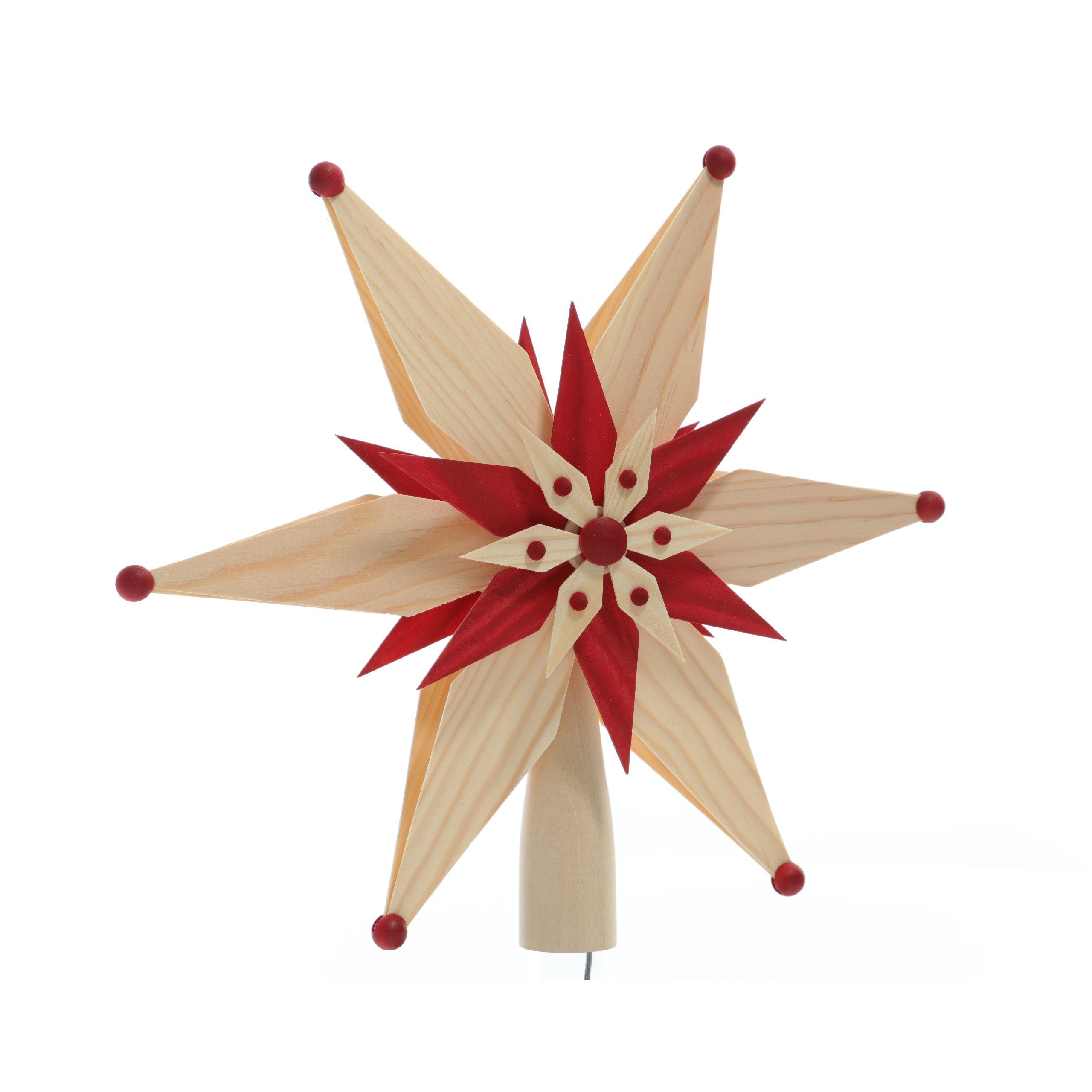 Baumschmuck Christbaumspitze el Beleuchtet doppelt aus Kiefernblätter Mittig Stern Rot (Beidseitig) Setzen Sie das Tüpfelchen auf das I oder die Christbaumspitze auf den Weihnachtsbaum. Machen Sie mehr aus Ihrem Christbaum. Diese schöne Christbaumspitze hat eine Размер vom 28 cm, ist komplett aus Lindenholz gefertigt. und kann per Aufnahme an der Unterseite auf die Baumspitze gesteckt werden. In der Mitte hat sie eine Nabe, mit einer elektrischen Beleuchtung, an Ihr verbinden sich ein kleiner roter und ein großer 6 eckiger Holzsterne zum Stern. BxHxT=25x25x7cm NEU |