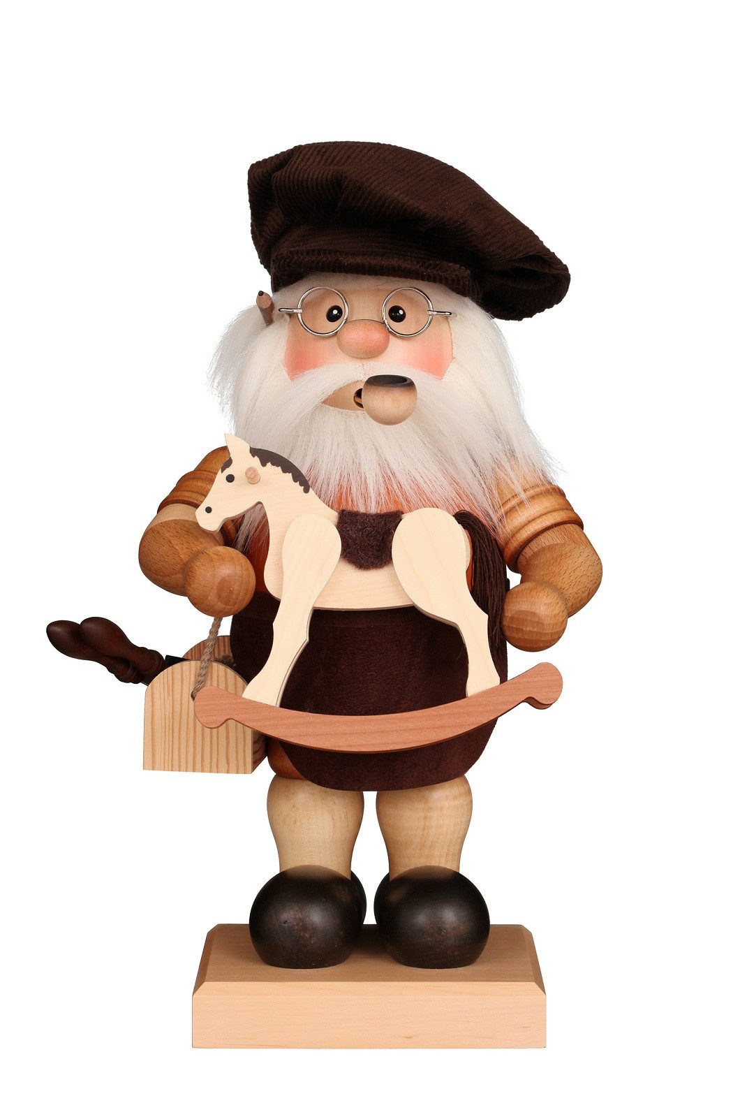 Stolz zeigt uns der Spielzeugmacher sein selbst gefertigtes Reiterlein. In Natur gehalten bleibt dieser Räuchermann zeitlos schön. Der Räuchermann Bäcker natur wird im Hause Christian Ulbricht in Handarbeit hergestellt,