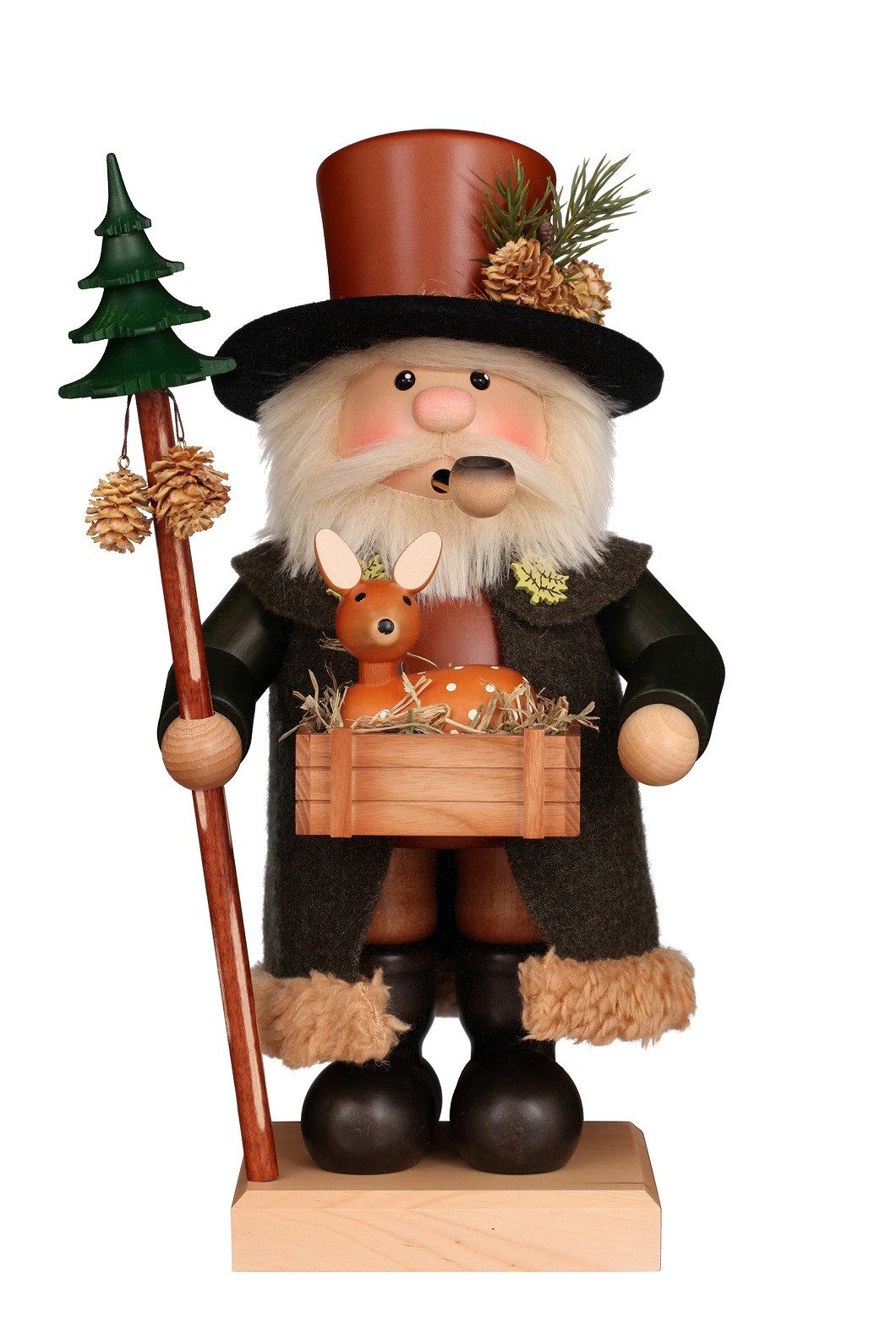 Gerade hat der Waldmann ein Rehkitz gerettet. Behutzsam trägt er es in einer Kiste voll Stroh nach Hause, um es wieder aufzupepeln. In Natur gehalten bleibt dieser Räuchermann zeitlos schön. Der Räuchermann Waldmann natur wird im Hause Christian Ulbricht in Handarbeit hergestellt,