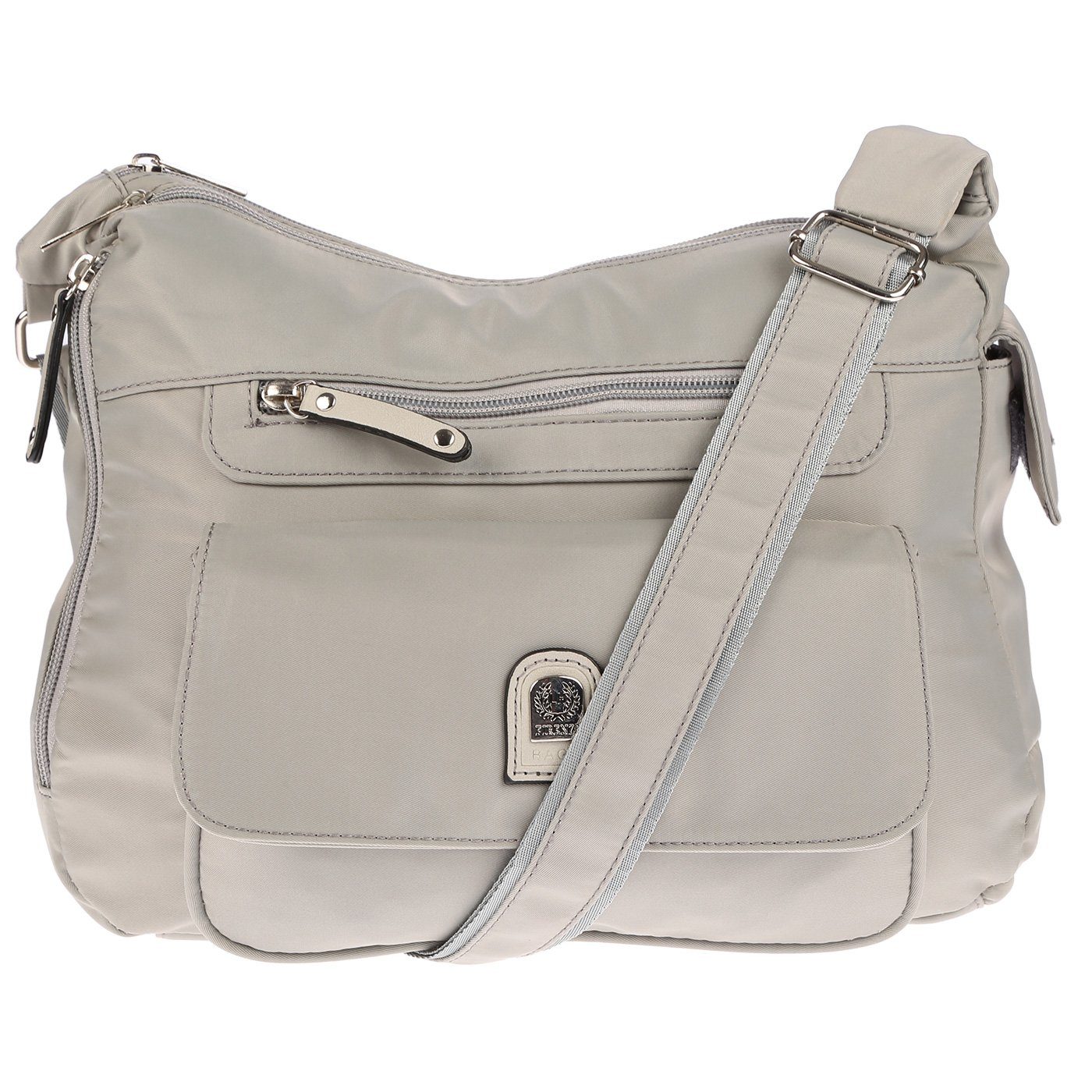 Die Tasche verfügt über zwei Fächer auf der Oberseite, wovon ein Fach ein Handyfach besitzt und das andere ein kleines Reißverschlussfach.
