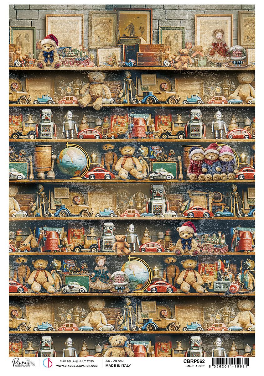 Die Motiv-Strohseide 'Toy Shop - Make a Gift' entführt dich in eine Welt voller nostalgischer Spielsachen. Das Naturpapier, hergestellt aus Pflanzenfasern, ist besonders reiß- und wasserfest. Ideal für kreative Bastelarbeiten mit der Servietten- und Decoupage-Technik. Ob gerissen, geschnitten oder im Ganzen verwendet, die Strohseide bietet vielfältige Gestaltungsmöglichkeiten für Scrapbooks, Grußkarten und Geschenkverpackungen. Verleihe Möbeln und Schubladen ein individuelles Aussehen. Die einseitige Bedruckung im DIN A4 Format macht jedes Projekt einzigartig. Säurefrei und 100 % Made und Printed in Italy, ist es ein Muss für jede Bastelkollektion.