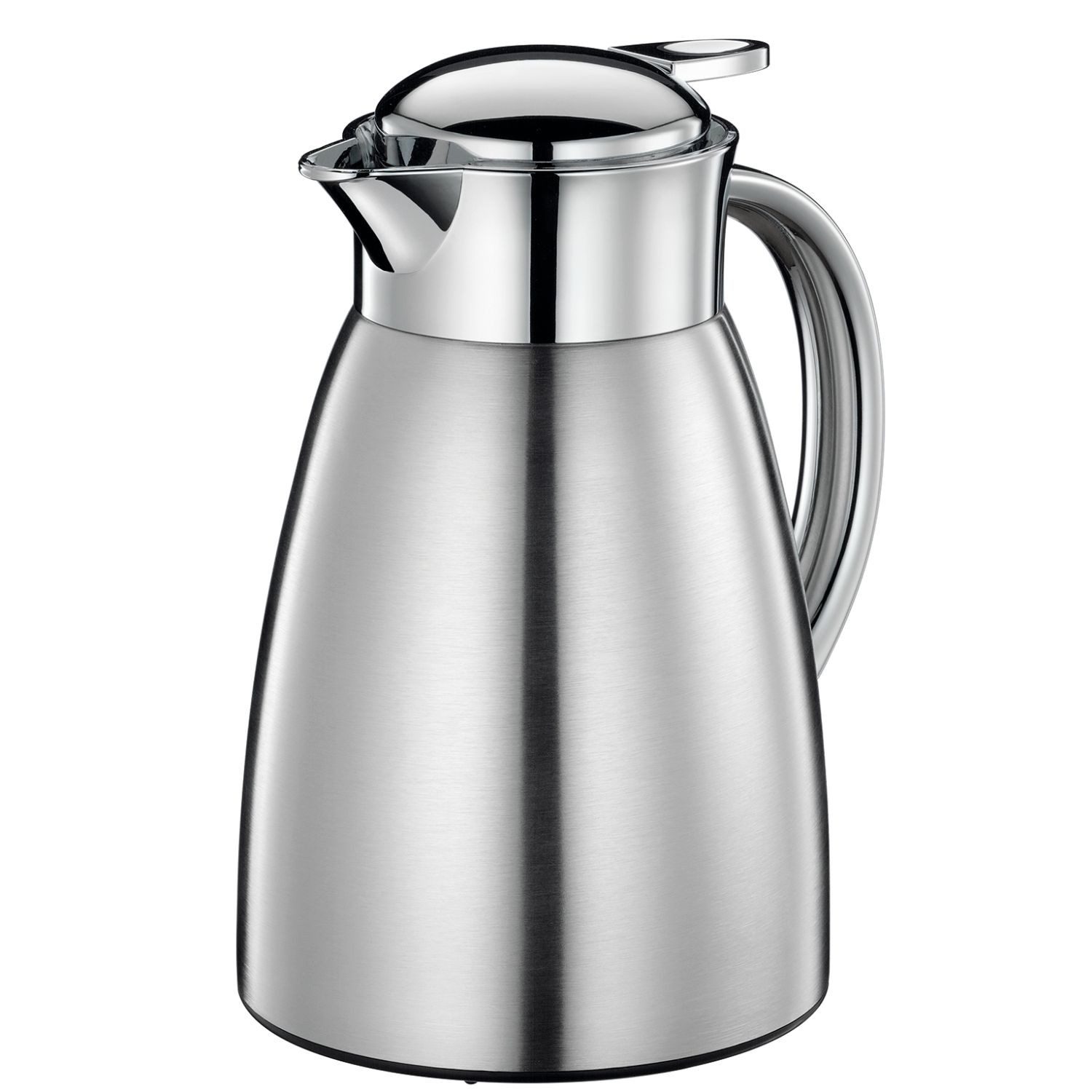 Всеs, was eine gute Thermoskanne ausmacht, bietet die Isolierkanne Triest von Cilio: dank Doppelwandsystem hält sie bis zu 12 Stunden heiß und bis zu 24 Stunden kalt, ihr formschönes Design aus Edelstahl bereichert jeden gedeckte Tafel und ihr Schraubverschluß ist mit einer praktischen Einhand-Ausgießtaste ausgestattet. Erhältlich ist sie in drei Größen, in der Варианты mit einem Volumen von einem Liter ist die Kanne 20,5 cm hoch und hat einen Durchmesser von 13,5 cm.