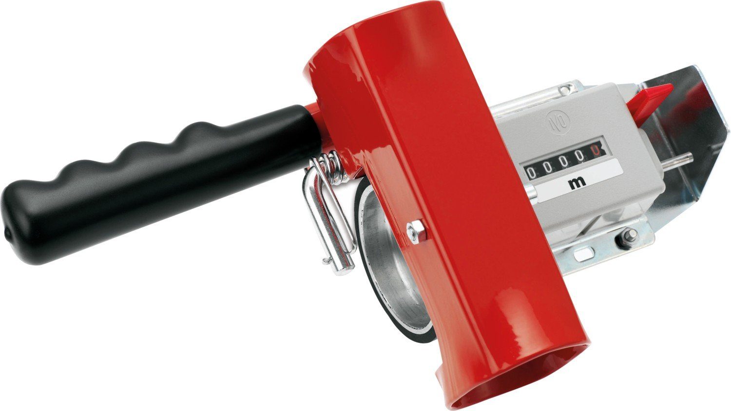 Kabellängen-Handmessgerät, Messgerät zur schnellen und genauen Bestimmung von Kabellängen, weiter Anwendungsbereich für alle Arten von Kabeln und ähnlicher Wickelgüter von 4 - 35 mm Durchmesser, automatische Kabelgrößen- Anpassung über Druckbügel, deutsches Markenzählwerk mit hoher Messgenauigkeit, Messbereich 0 bis 9999, 9 m, Nullstellung durch Reset- Hebeltaster, gummiertes Messrad aus Aluminium, abschraubbarer Handgriff für mobilen Einsatz auf Baustellen, in Lager, Werkstatt etc. , mit Aufnahmeschaft für stationären Einsatz in Verbindung mit allen Cimco-Trommelfix Abrollhilfen und dem Cimco-Verbindungsgestell, auch für den Kabelring-Abspuler (Bestellnr. 14 2740) montierbar