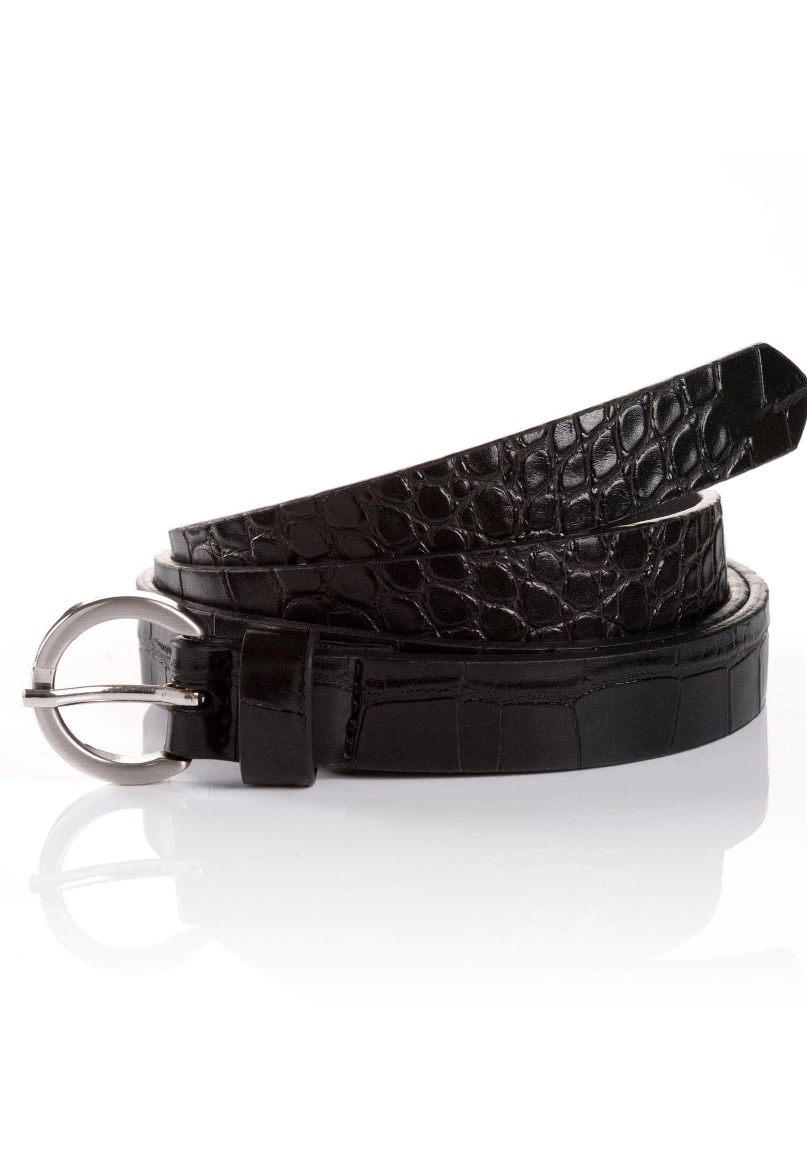 Schmal und schick: Der Gürtel ist 2 cm breit und kann daher gut zu schicken Hosenanzügen oder Blusen getragen werden, um einen eleganten Stil zu unterstreichen. Mit farblich abgestimmten Schuhen beweist du modisches Fingerspitzengefühl und dein Outfit für geschäftliche Treffen oder offizielle Anlässe steht! Jetzt sollte dein neues Accessoire auch noch richtig sitzen: Das tut es, wenn beim geschlossenen Gürtel zwei bis drei Löcher am Rand sichtbar bleiben.