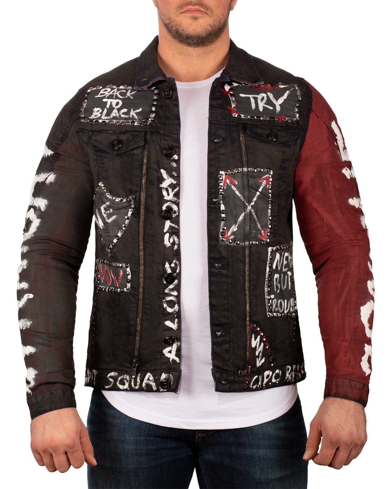 Die außergewöhnliche Herren Jeansjacke von Cipo & Baxx ist ein echter Hingucker für alle, die es gerne auffällig und individuell mögen. Mit auffälligen Nieten und funkelnden Strasssteinen versehen, setzt die Jacke markante Akzente. Verschiedene Farb- und Teilbereiche sowie kreative Schriftzüge mit Farbklekseffekten verleihen der Jacke einen unverwechselbaren, urbanen Look.
