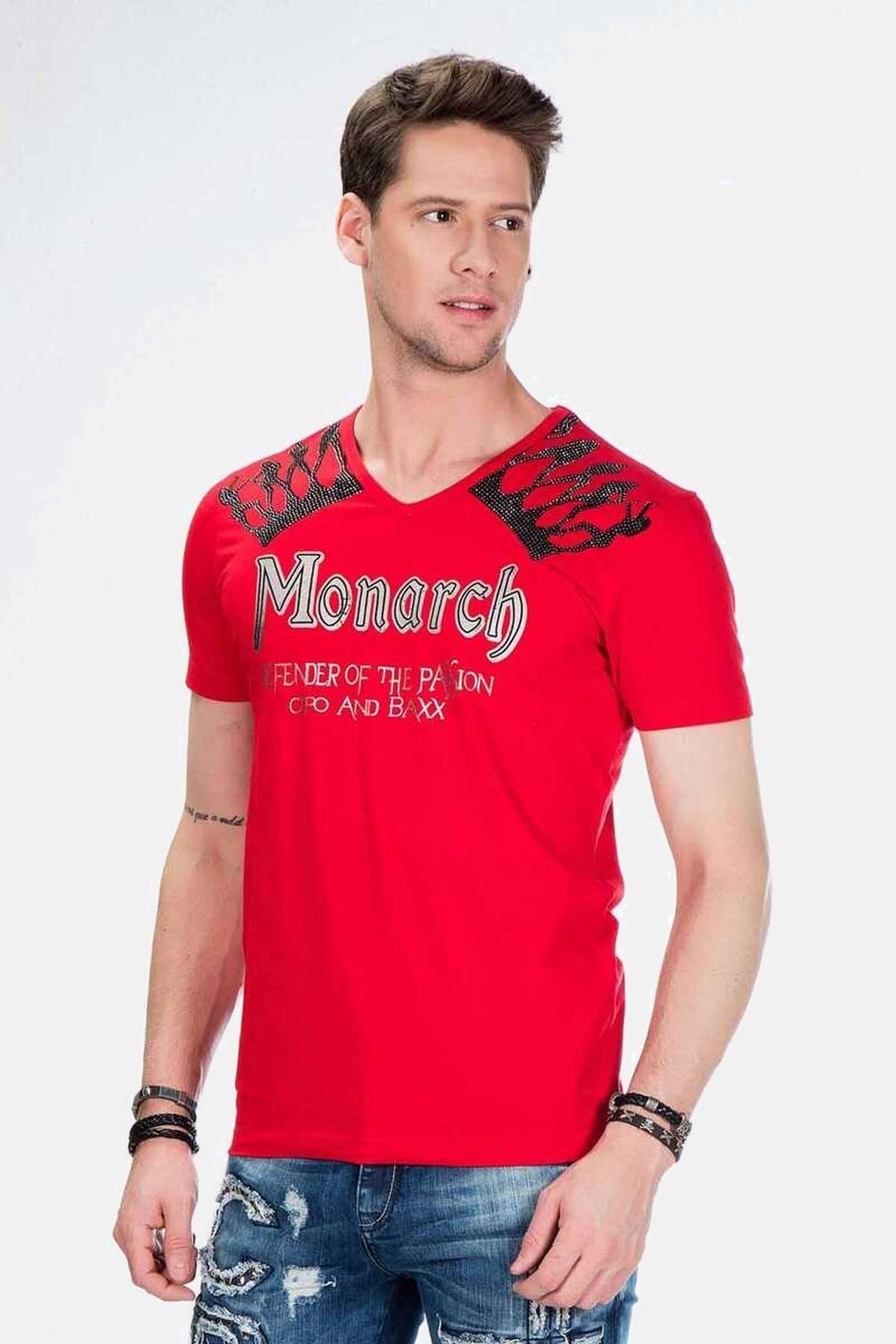 Mit seinem einzigartigen Design ist dieses T-Shirt die richtige Wahl für extravagante Männer! Der unifarbene Baumwollmix wird mit Kronen aus Frauensilhouetten und monarchischen Schriftzügen zum Hingucker schlechthin. Mit angesagtem Foil-Print und edlen Ziersteinen ziehst du garantiert Blicke auf dich und kannst dabei auf den Trendfaktor von Cipo & Baxx bauen. Dank des stretchigem Materials passt sich das schmale Shirt ideal deiner Figur an und punktet mit einem optimalen Sitz. Wie wäre es dazu mit einer Destroyed-Jeans und Sneakers? Modell: CT-377.