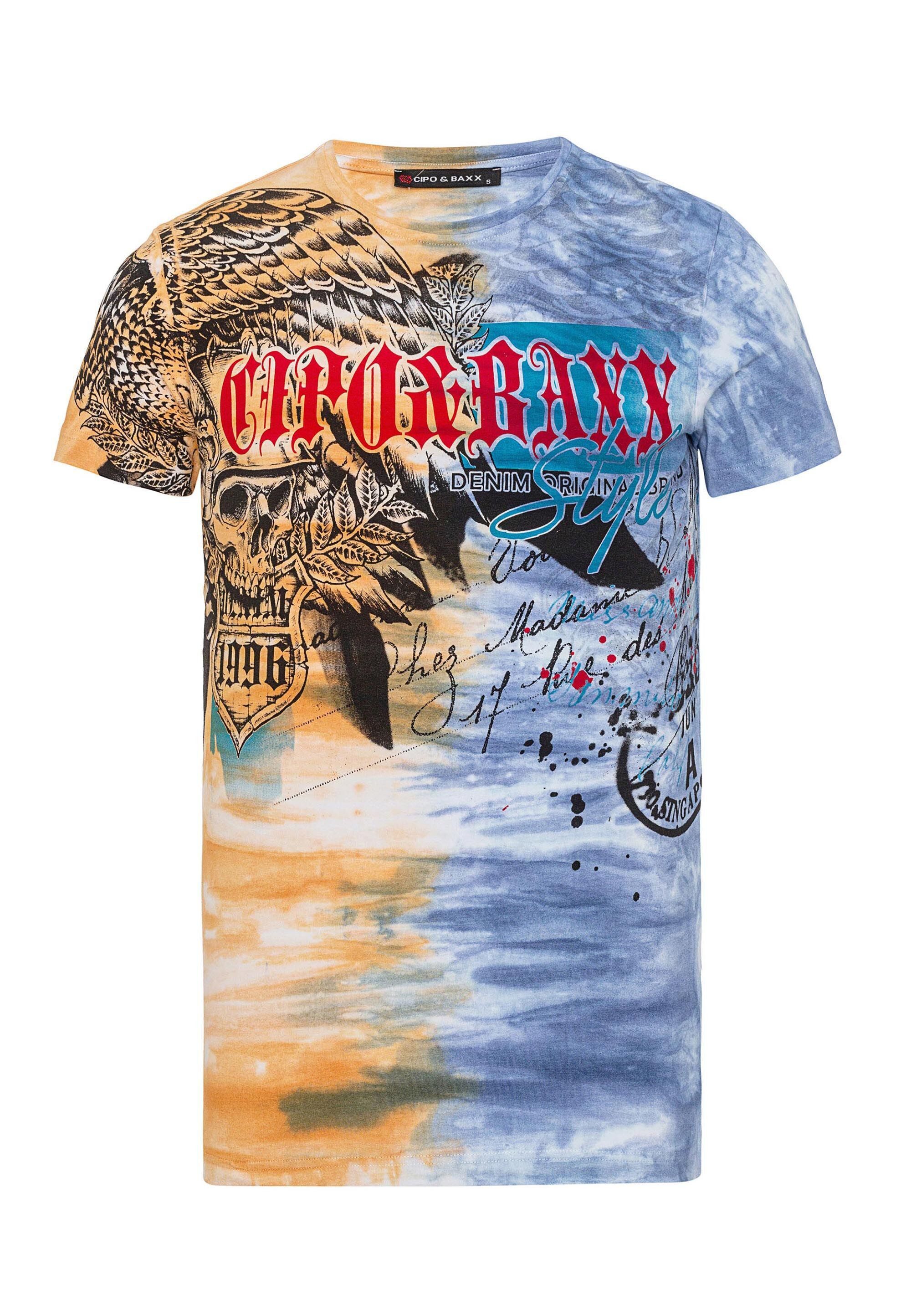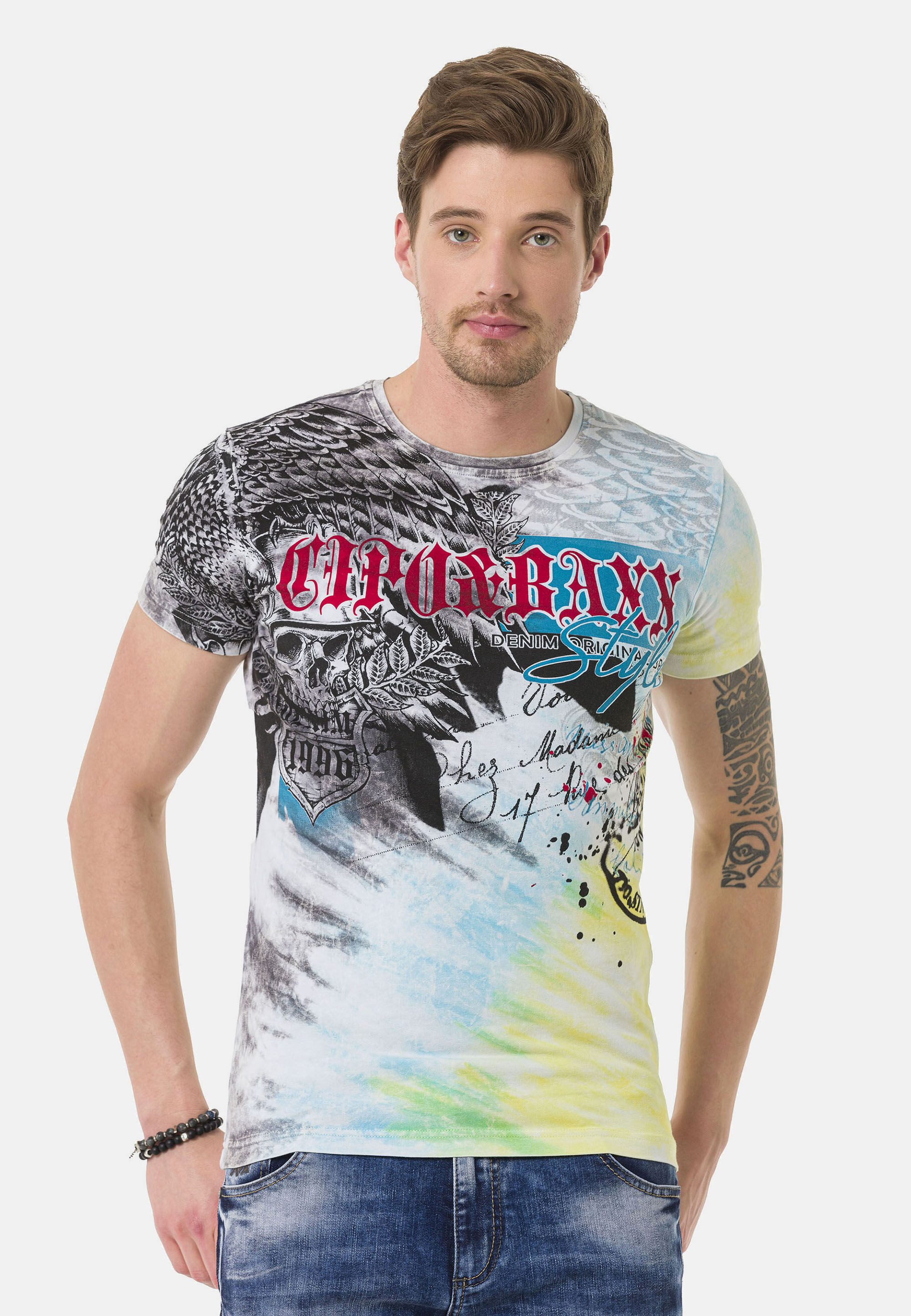 Mit diesem T-Shirt der Marke Cipo & Baxx für Herren kannst du nichts falsch machen. Mit seinem Design beweist Du modischen Stil und wertest jedes Outfit gekonnt auf, während der tolle Tragekomfort Dich begeistern wird. Das Modell kommt mit einer hochwertigen Herstellung aus Baumwolle und Elasthan. Es besitzt einen klassischen Rundhals-Ausschnitt und wird zu einem Hingucker dank des farbenfrohen Allover-Musters, welches durch einen coolen Print auf Front und Rücken perfekt abgerundet wird.
