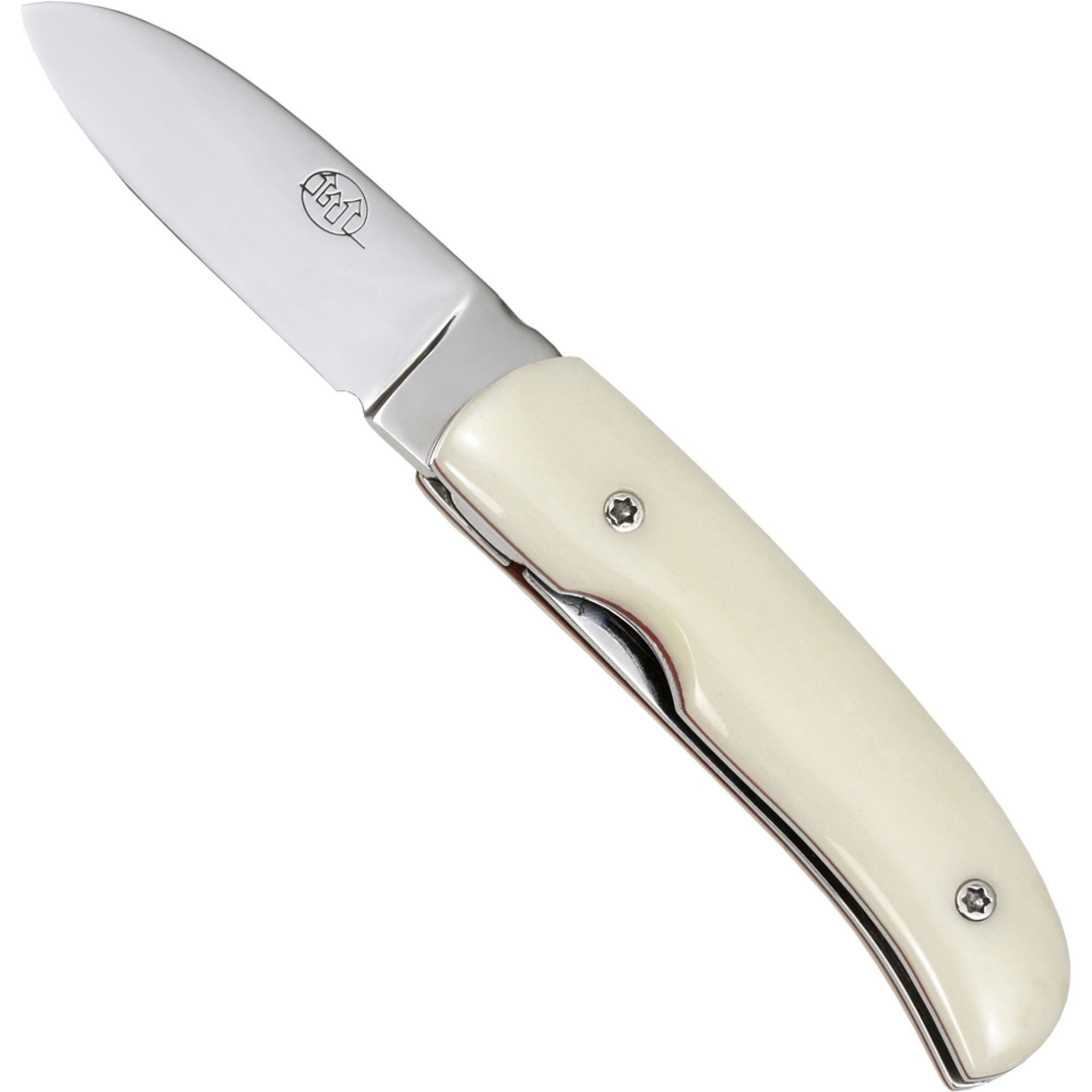 Klinge ist handgeschmiedet aus N690Co rostfreiem Stahl mit einer Härte von 58-60° Rockwell. Der Klingenrücken ist am Ansatz fein verziert. Die Griffbeschalung ist aus Knochen mit schwarzen Ziereinlagen zwischen Platinen und Griffschalen. Die Arretierung der Klinge erfolgt über einen Liner-Lock.