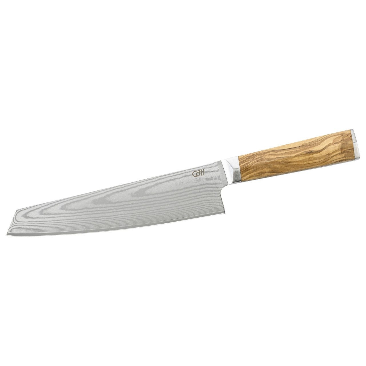 Entdecken Sie das CJH Kiritsuke-Messer, ein wahres Meisterwerk der Schmiedekunst. Mit einer beeindruckenden Gesamtlänge von 34 cm und einer Klinge aus 67 Lagen Damast Stahl, bietet dieses Messer eine unvergleichliche Schärfe und Haltbarkeit. Der ergonomische Griff aus edlem Olivenholz liegt perfekt in der Hand und ermöglicht präzises Arbeiten. Ob in der heimischen Küche oder als professionelles Werkzeug – dieses Messer ist ein unverzichtbarer Begleiter für jeden, der Wert auf Qualität und Design legt. Lassen Sie sich von der Perfektion und Eleganz dieses Messers inspirieren und erleben Sie das Kochen auf einem neuen Niveau!