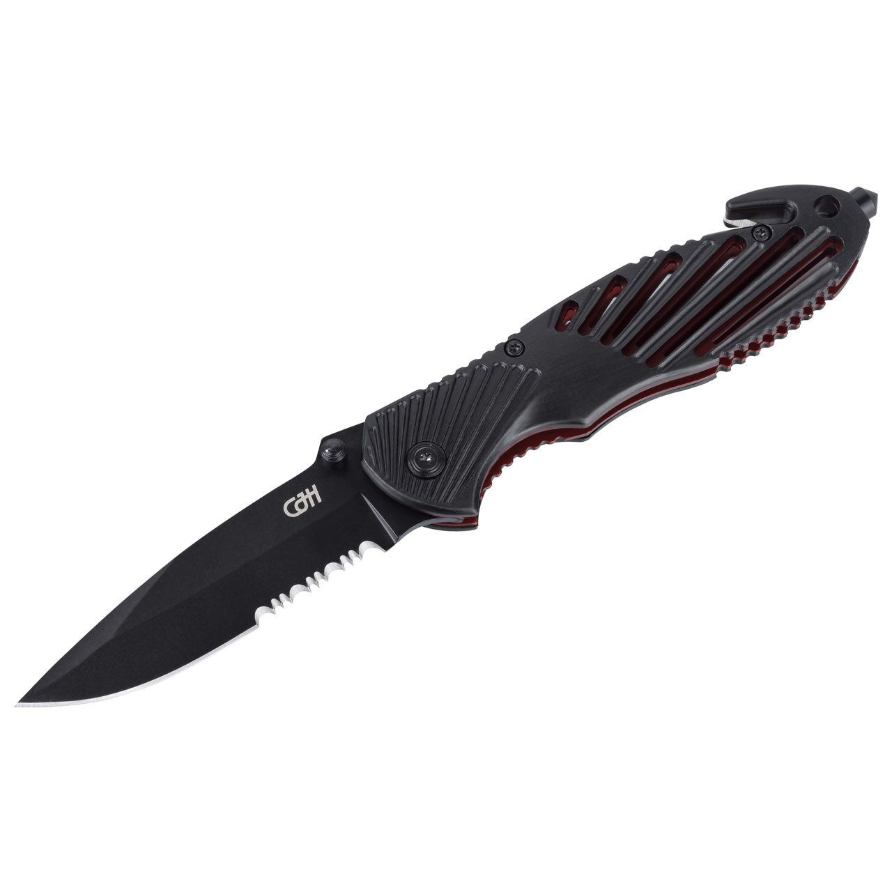 Ein CJH Einhand-Rettungsmesser in Drop Point Form. Die schwarz beschichtete Klinge aus rostfreiem 420 Stahl verfügt über einen partiellen Wellenschliff. Beidseitige Daumenpins ermöglichen Rechts- sowie Linkshändern ein schnelles Öffnen des Messers. Gesichert wird die Klinge über eine Liner Lock Arretierung. Die schwarzen Aluminium-Heftschalen in partieller Skelettbauweise ermöglichen im Zusammenspiel mit den roten Platinen ein schönes Farbspiel. Mit Glasbrecher, Gurtschneider und Gürtelclip.