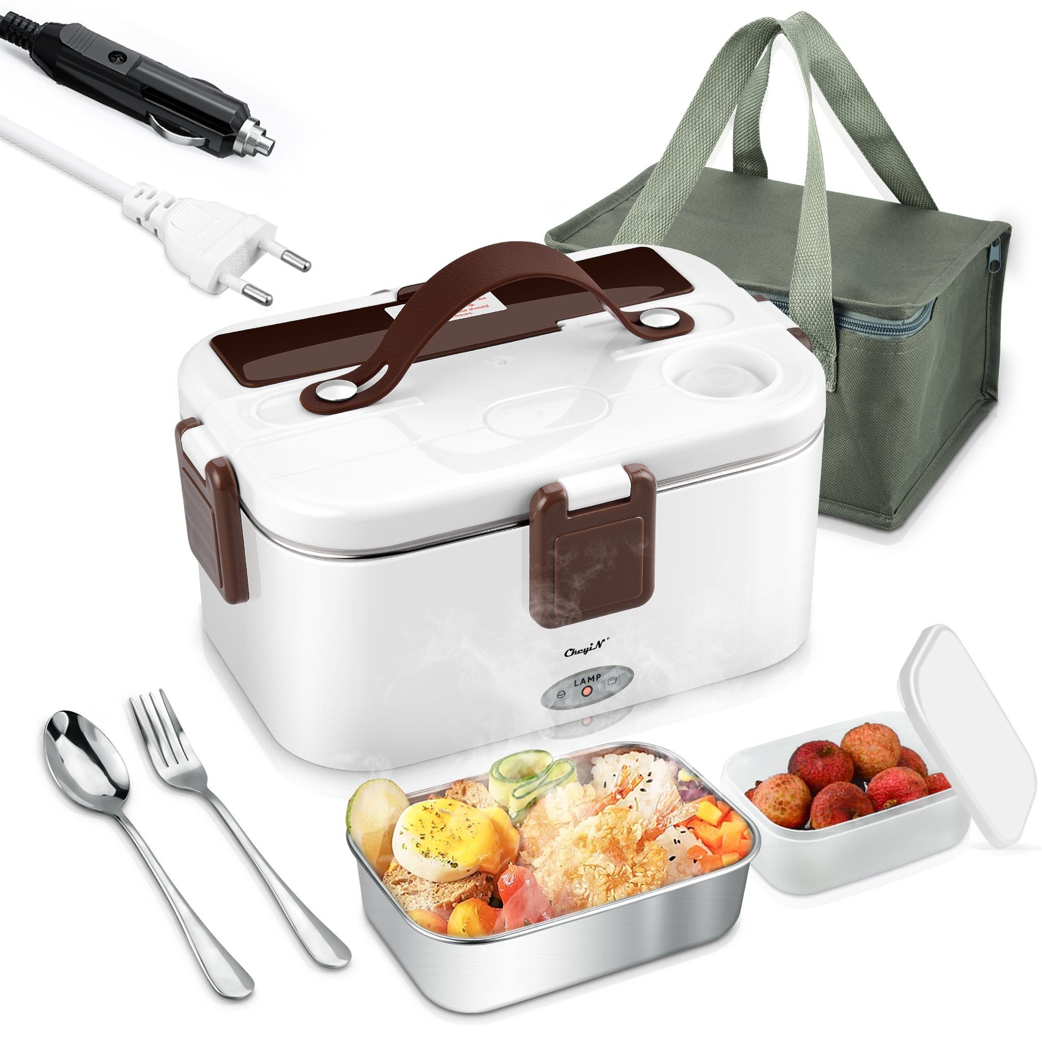 Diese beheizte Lunchbox hat ein großes Fassungsvermögen von 1,8 l sowie eine Obstbox mit 0,45 l Fassungsvermögen (PP-Material); Behälter aus Edelstahl in Lebensmittelqualität, langlebig, korrosionsbeständig, hochtemperaturbeständig, geruchlos, kratzfest und leicht zu verwenden sauber. Es kann zu Hause oder im Auto verwendet werden, anwendbare Spannung (12 V für Autos, 24 V für LKWs), egal ob Sie zu Hause, auf Reisen oder bei der Arbeit sind, Sie können jederzeit und überall warme Mahlzeiten zu sich nehmen.