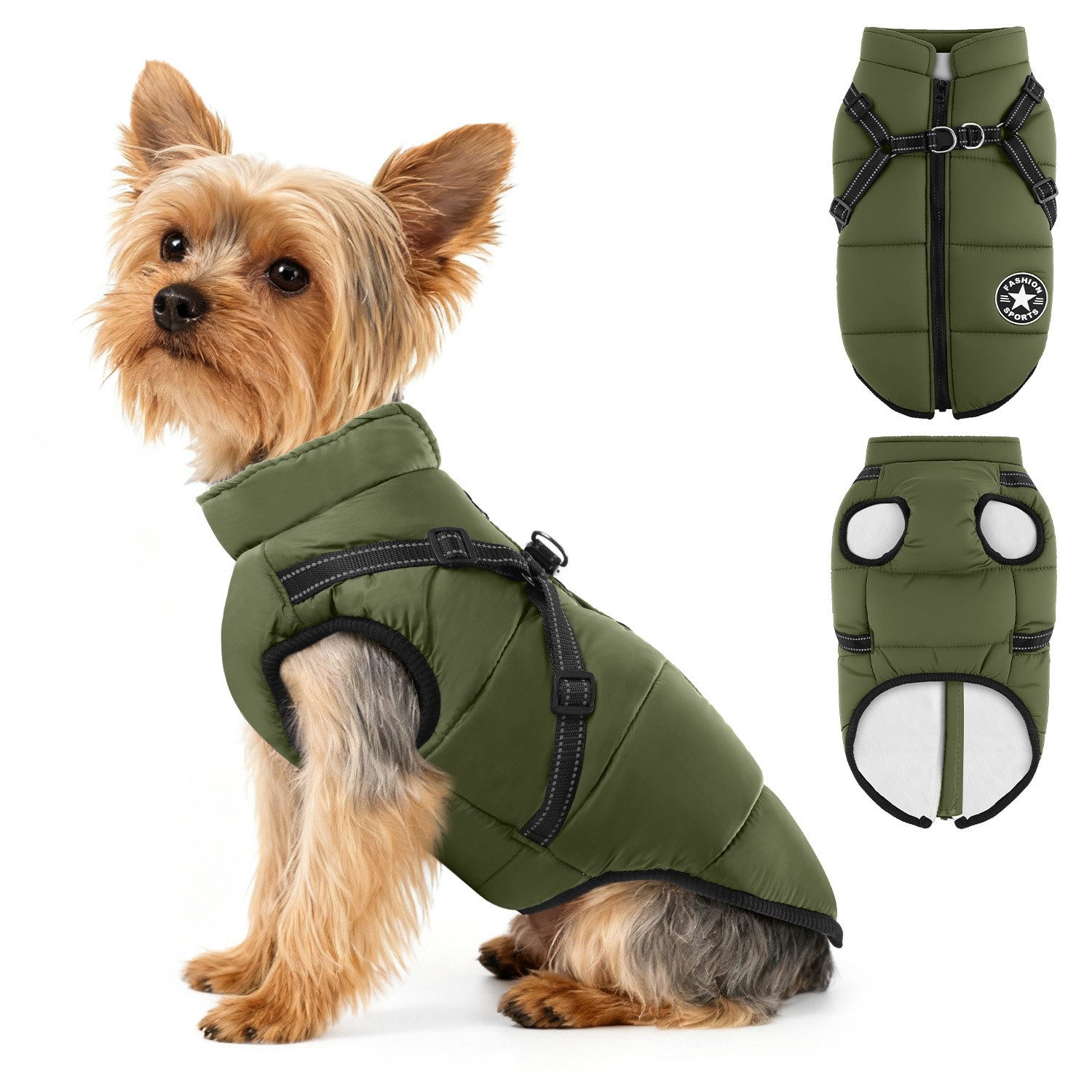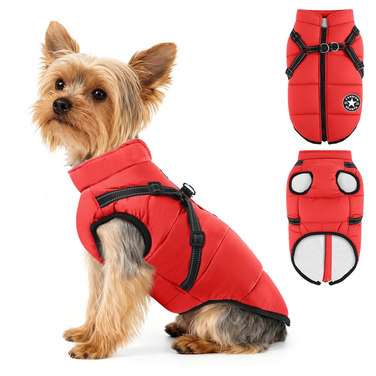 Geschirrdesign: Das Geschirrdesign der Jacke ermöglicht es Ihnen, eine Leine direkt anzubringen, sodass keine zusätzliche Leine erforderlich ist, die Druck auf den Hals Ihres Haustieres ausüben könnte. Die Reißverschlüsse des Geschirrs wurden verbessert und verstärkt und verfügen über stabile und reißfeste D-Ringe, die ein Lösen oder Beschädigen durch die lebhafte Aktivität Ihres Haustieres verhindern. Die Reißverschlüsse gleiten reibungslos und verhindern außerdem, dass sich das Fell oder die Haut Ihres Hundes versehentlich darin verfängt.