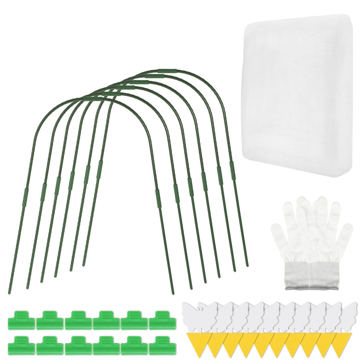 GEWÄCHSHAUS-TUNNEL-SET: Dieses Produkt enthält 12 gerade Rohre, 12 gebogene Rohre, 16 Klammern, 18 Verbindungsrohre und 10 Schmetterlings-Klebe-Insektenblätter sowie ein Paar Handschuhe.