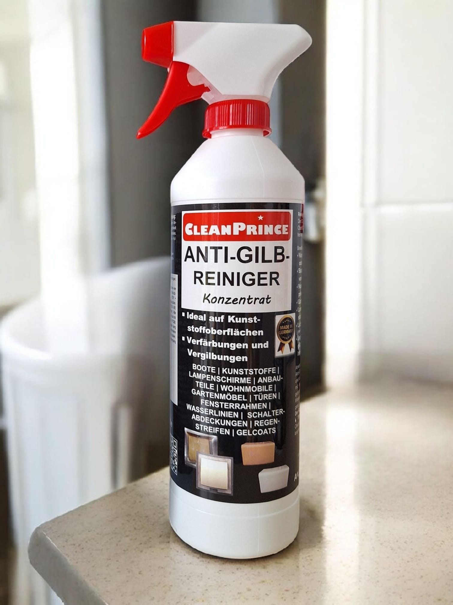 Zubereitungs- und Aufbewahrungshinweise | Anti-Gilb-Reiniger auf die Fläche aufsprühen und ca. 5 Minuten einwirken lassen. Erst dann mit einem Schwamm in kreisenden Bewegungen verreiben. Anschließend mit klarem Wasser abwaschen. Wiederholen Sie den Vorgang falls notwendig. Der Reiniger darf nicht eintrocknen. TIPP: Im Anschluss empfehlen wir die Cleanprince Kunststoff-Imprägnierung um einen langfristigen Schutz zu erreichen. |