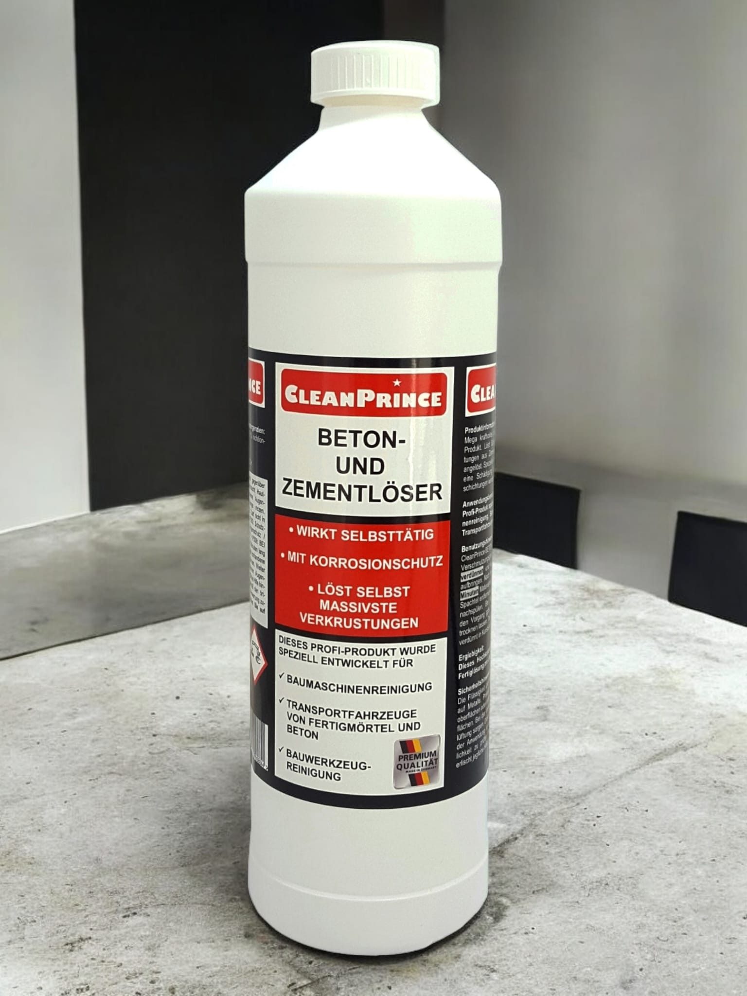 Zubereitungs- und Aufbewahrungshinweise | CleanPrince Beton- und Zementlöser je nach Verschmutzungsgrad 1:1 oder bis 1:4 mit Wasser verdünnen und auf die zu reinigende Fläche aufbringen. Nach einer Einwirkzeit von 5 bis 10 Minuten Materialreste mit einer harten Bürste oder Spachtel entfernen und mit reichlich klarem Wasser nachspülen. Bei hartnäckigen Verschmutzungen den Vorgang ggfs. wiederholen. Untergrund nicht trocknen lassen. Tauchbadanwendungen 1:2 bis 1:4 verdünnt in Kunststoffwannen ausführen. Ergiebigkeit: Dieses Hochkonzentrat ergibt bis zu 5 Liter Применитьlösung pro Liter Konzentrat. Sicherheitshinweise zur Anwendung: Die Flüssigkeit und deren Dämpfe wirken korrosiv auf Metalle. Produkt nicht anwenden an Chromoberflächen oder anderen säureempfindlichen Oberflächen. Bei der Verwendung für ausreichende Belüftung sorgen. Dieses Produkt ist grundsätzlich vor der Anwendung an verdeckter Stelle auf Verträglichkeit zu prüfen. Bei sachfremder Anwendung erlischt jegliche Haftung für mögliche Schäden. |