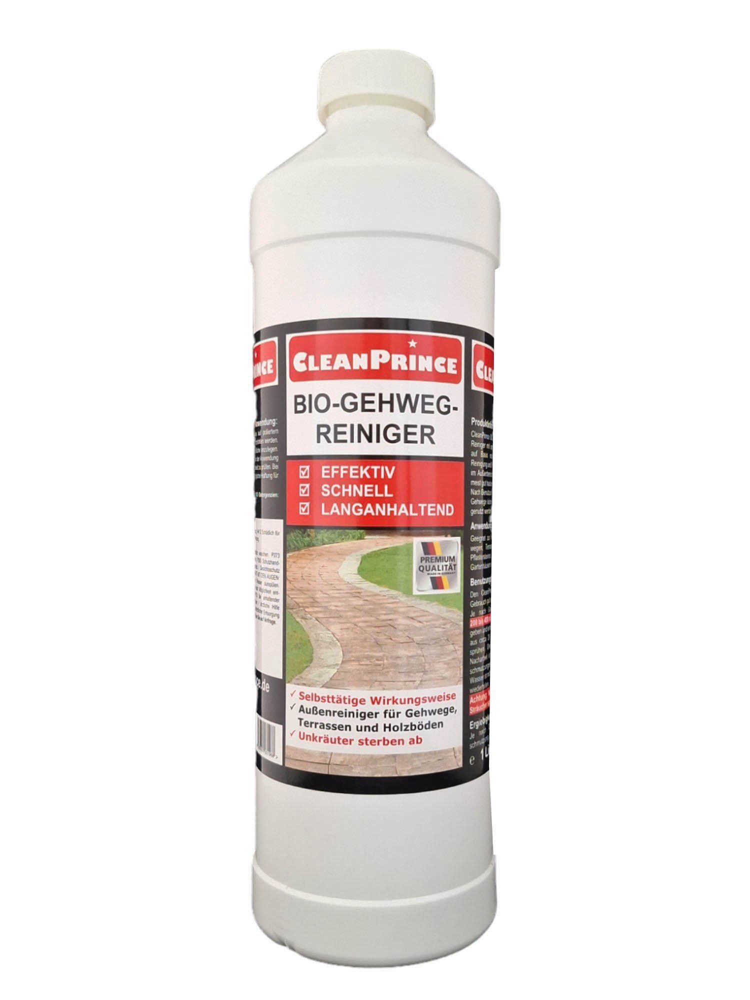 Biologischer Außenreiniger für Gehwege, Terrassen und Holzböden. Cleanprince Bio-Gehweg-Reiniger: > Selbsttätige Wirkungsweise > Aber Achtung: Unkräuter und Pflanzen sterben ab! ##### Описание товара (мы ещё работаем над переводом, извините за неудобство): CleanPrince Bio-Gehweg-Reiniger ist ein Bio-Reiniger mit speziell entwickelter Tiefenwirkformel auf Basis natürlicher Rohstoffe zur effektiven Reinigung und Pflege von Gehwegen und Terrassen im Außenbereich. Die gebrauchsfertige Lösung ist meist gut hautverträglich und nicht umweltbelastend. Nach Benutzung besteht keine Gefahr für Haustiere. Gehwege können sofort nach Abtrocknung wieder genutzt werden. ##### Anwendungsbereiche, Anwendung: Geeignet zur Reinigung von Gartenwegen, Gehwegen, Terrassenplatten, Mauern, Grabsteinen, Pflastersteinen, Holzoberflächen, Gartenzäunen, Gartenhäuschen uvm. Den CleanPrince Bio-Gehweg-Reiniger vor Gebrauch gut schütteln. Je nach Grad der Verschmutzung zwischen 200-400 ml Konzentrat auf einen Liter Wasser geben und einrühren. Die zu reinigende Fläche dann aus circa 20 cm Entfernung begießen oder besprühen. Der Reiniger wirkt selbsttätig, eine Nacharbeit ist daher nur bei äußerst groben Verschmutzungen notwendig. Bitte nicht mit Wasser nachspülen. Falls nötig Vorgang wiederholen. Achtung: Nicht auf Pflanzen, Unkräuter oder Sträucher sprühen, diese sterben ab! ##### Sicherheitshinweise: Der Einsatz dieses Bio-Produktes auf poliertem Marmor kann nicht bedenkenlos empfohlen werden. Wir empfehlen deshalb eine Probefläche anzulegen. Dieses Produkt ist grundsätzlich vor der Anwendung an verdeckter Stelle auf Verträglichkeit zu prüfen. Bei sachfremder Anwendung erlischt jegliche Haftung für mögliche Schäden. ##### Ergiebigkeit: Je nach Oberflächenbeschaffenheit und Verschmutzung zwischen 50 m²-100 m² pro Liter Reiniger. ##### Inhaltsstoffangabe nach Detergenzienverordnung 648/2004 EG: 5 % - < 15 % anionische Tenside ##### Rezepturinformationen: Aqua, Tritium Spelta Extract, Lactic Acid, Nonan Acid, Cocamidopropylbetaine, Alkohol Dental ##### GEFAHRENHINWEISE: H319 Verursacht schwere Augenreizung. H412 Schädlich für Wasserorganismen, mit langfristiger Wirkung. ##### SICHERHEITSRATSCHLÄGE: P264 Nach Gebrauch Hände gründlich waschen. P273 Freisetzung in die Umwelt vermeiden. P280 Schutzhandschuhe/Schutzkleidung/Augenschutz/Gesichtsschutz tragen. P305+P351+P338 BEI KONTAKT MIT DEN AUGEN: Einige Minuten lang behutsam mit Wasser ausspülen. Eventuell vorhandene Kontaktlinsen nach Möglichkeit entfernen. Вперед ausspülen. P337+P313 Bei anhaltender Augenreizung: Ärztlichen Rat einholen/ärztliche Hilfe hinzuziehen. P501 Inhalt/Behälter behördlicher Entsorgung zuführen. Sicherheitsdatenblätter erhalten Sie auf Anfrage. Signalwort: Achtung