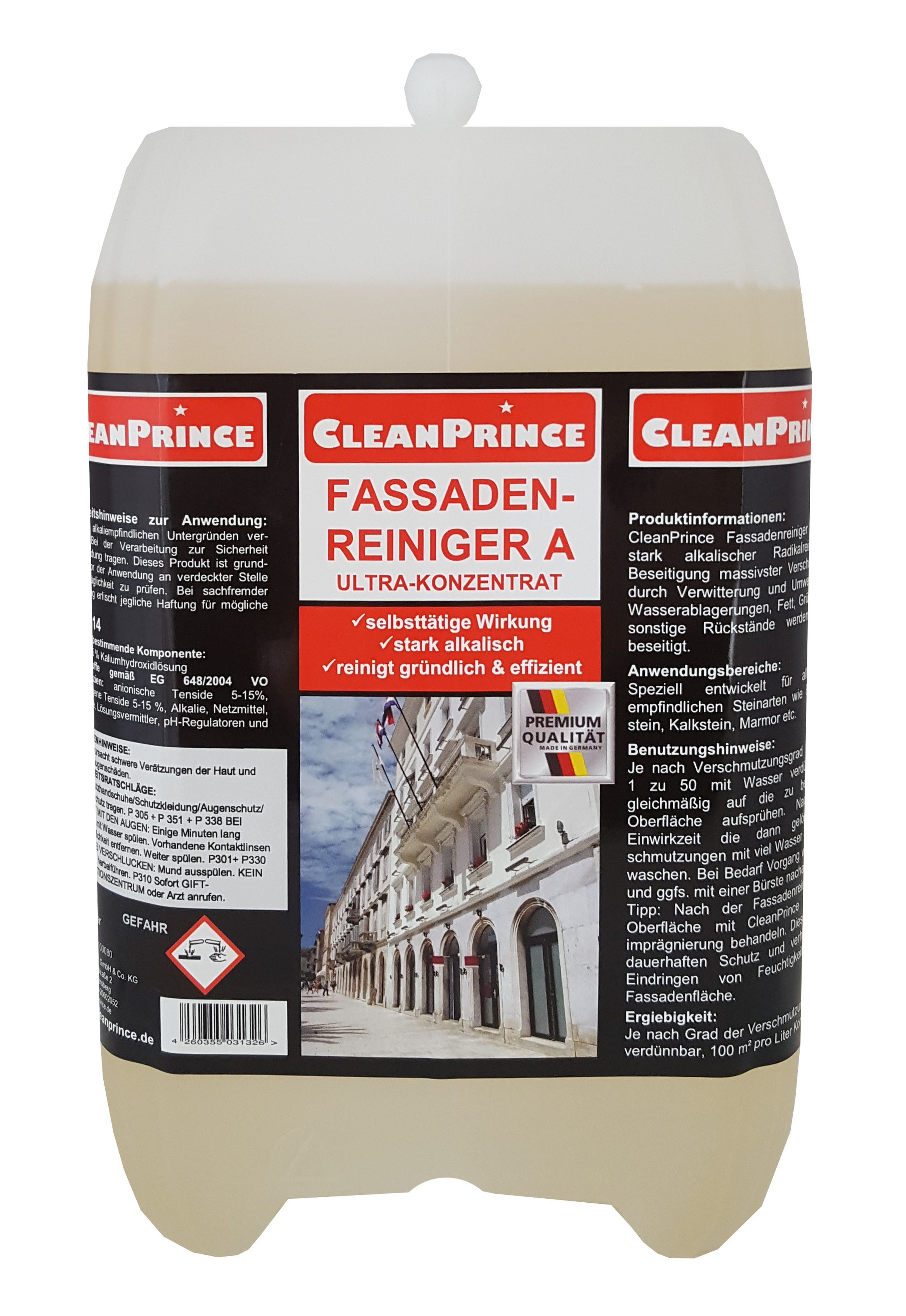 Zubereitungs- und Aufbewahrungshinweise | Speziell entwickelt für alle säureempfindlichen Steinarten wie Betonwerkstein, Kalkstein, Marmor etc. Je nach Verschmutzungsgrad 1 zu 3 bis 1 zu 50 mit Wasser verdünnen und gleichmäßig auf die zu behandelnde Oberfläche aufsprühen. Nach kurzer Einwirkzeit die dann gelösten Verschmutzungen viel Wasser einfach abwaschen.Bei Bedarf Vorgang wiederholen und ggfs. mit einer Bürste nacharbeiten. Tipp: Nach der Fassadenreinigung die Oberfläche mit CleanPrince Fassadenimprägnierung behandeln. Diese sorgt für dauerhaften Schutz und verhindert das Eindringen von Feuchtigkeit in die Fassadenfläche. |