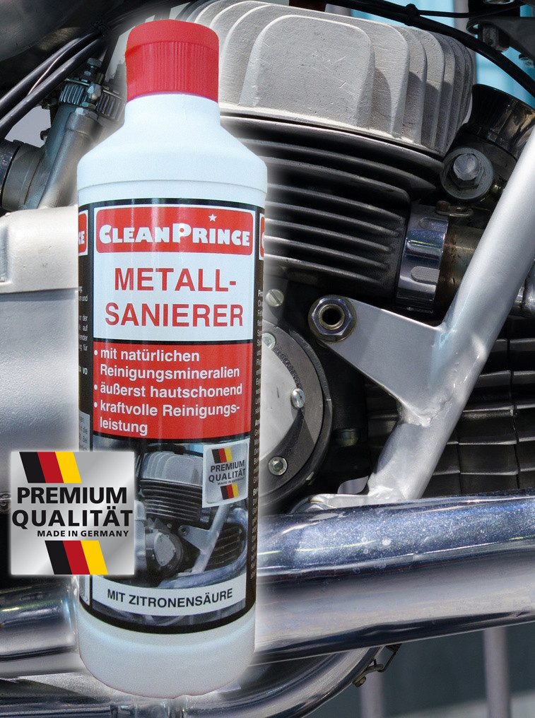 CleanPrince METALLSANIERER beseitigt Fettverschmutzungen, Kalk- und Wasserflecken sowie Ablagerung, Grünspan etc. | Speziell konzipiert zur Reinigung von Spülbecken, Edelstahltöpfen, Silberbesteck und den Kfz-Bereich. | Metalloxidierungen und Flugrost werden schonend und zuverlässig entfernt. Schutzkomponenten mit rückfettenden Eigenschaften erzeugen eine glatte, wasserabweisende Oberfläche. Lebensmittelrechtlich zugelassene Zitronensäure erzeugt hygienische Sauberkeit. | Anwendungsbereiche, Anwendung: Geeignet für alle Metalloberflächen aus Chrom, Messing, Edelstahl, Kupfer, Gold und Silber. | Dieses Produkt wird eingesetzt in technischen Bereichen, an Fahrzeugen und in lebensmittelnahen Bereichen wie im Haushalt und in Großküchen. Den CleanPrince Metallsanierer vor Gebrauch stets gut schütteln um eine gleichmäßige Verteilung der speziell abgestimmten Reibekörper zu gewährleisten. Das Material unverdünnt auf ein feuchtes Tuch oder Schwamm geben und die zu behandelnde Fläche kreisförmig einreiben. Nach kurzer Einwirkzeit gründlich mit Wasser abspülen. | Sicherheitshinweise: Nicht geeignet für eloxiertes Aluminium und feuerverzinkte Flächen. Dieses Produkt ist grundsätzlich vor der Anwendung an verdeckter Stelle auf Verträglichkeit zu prüfen. Bei sachfremder Anwendung erlischt jegliche Haftung für mögliche Schäden. | Technische Daten: Dichte: 1,26 g pro cm³ / Aussehen: weiß / pH-Wert: ca. 2,5 / Geruch: Zitrone | Inhaltsstoffangabe nach Detergenzienverordnung 648/2004 EG: < 5 % anionische Tenside, < 5 % nichtionische Tenside | Sicherheitsdatenblätter erhalten Sie auf Anfrage.