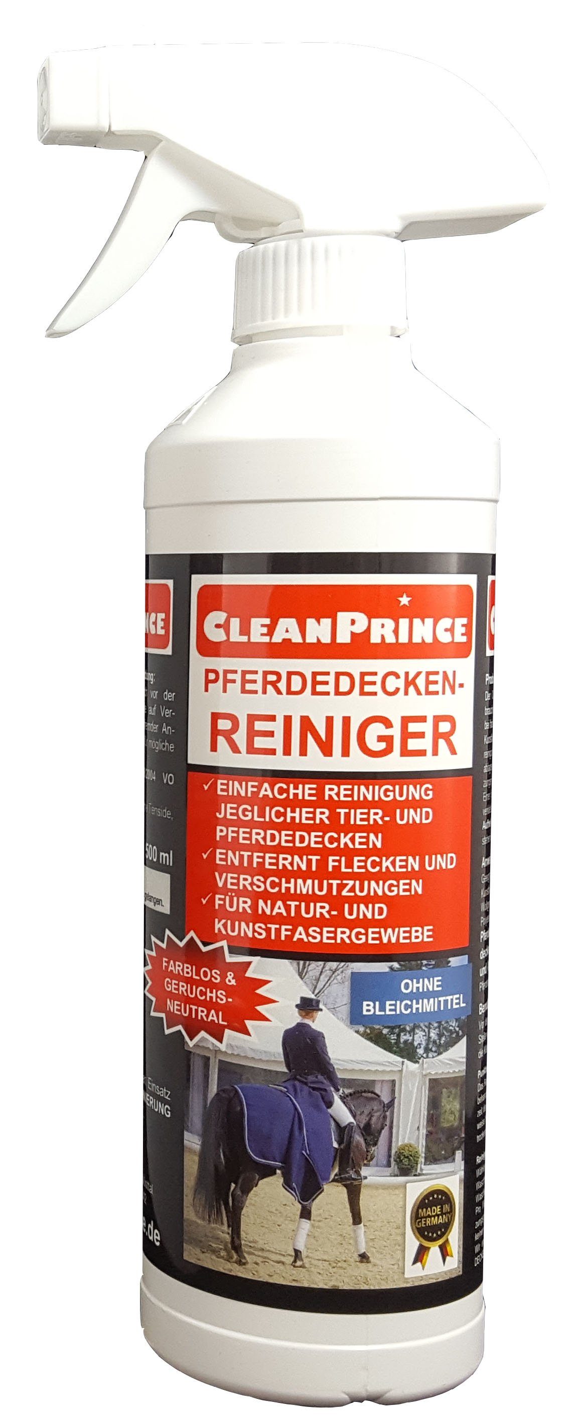 Benutzungshinweise: Vor der Erstwäsche ist die Farbechtheit an verborgener Stelle vorab zu prüfen. Wir empfehlen vor der Reinigung die Klettverschlüsse manuell zu enthaaren. Punktuelle Reinigung: Das Reinigungsmittel aus circa 20 cm Entfernung auf die zu behandelnde Fläche aufsprühen. Nach einer kurzen Einwirkzeit den Schmutz mit einem sauberen Mikrofasertuch kreuzweise herauswischen. Die behandelte Fläche anschließend trockenreiben um eine Randbildung zu vermeiden. Reinigung in der Waschmaschine oder im Waschbottich: Wählen Sie ein Waschprogramm in der vorgegebenen Waschtemperatur. Diese finden Sie auf dem eingenähten Waschetikett auf der Pferdedecke. Pro Waschgang ca. 50 - 150 ml (je nach Verschmutzungsgrad) anstelle von Waschpulver verwenden. Bitte keinen Weichspüler einsetzen. TIPP: Nach der Trocknung mit Cleanprince Pferdedecken-Imprägnierung behandeln.