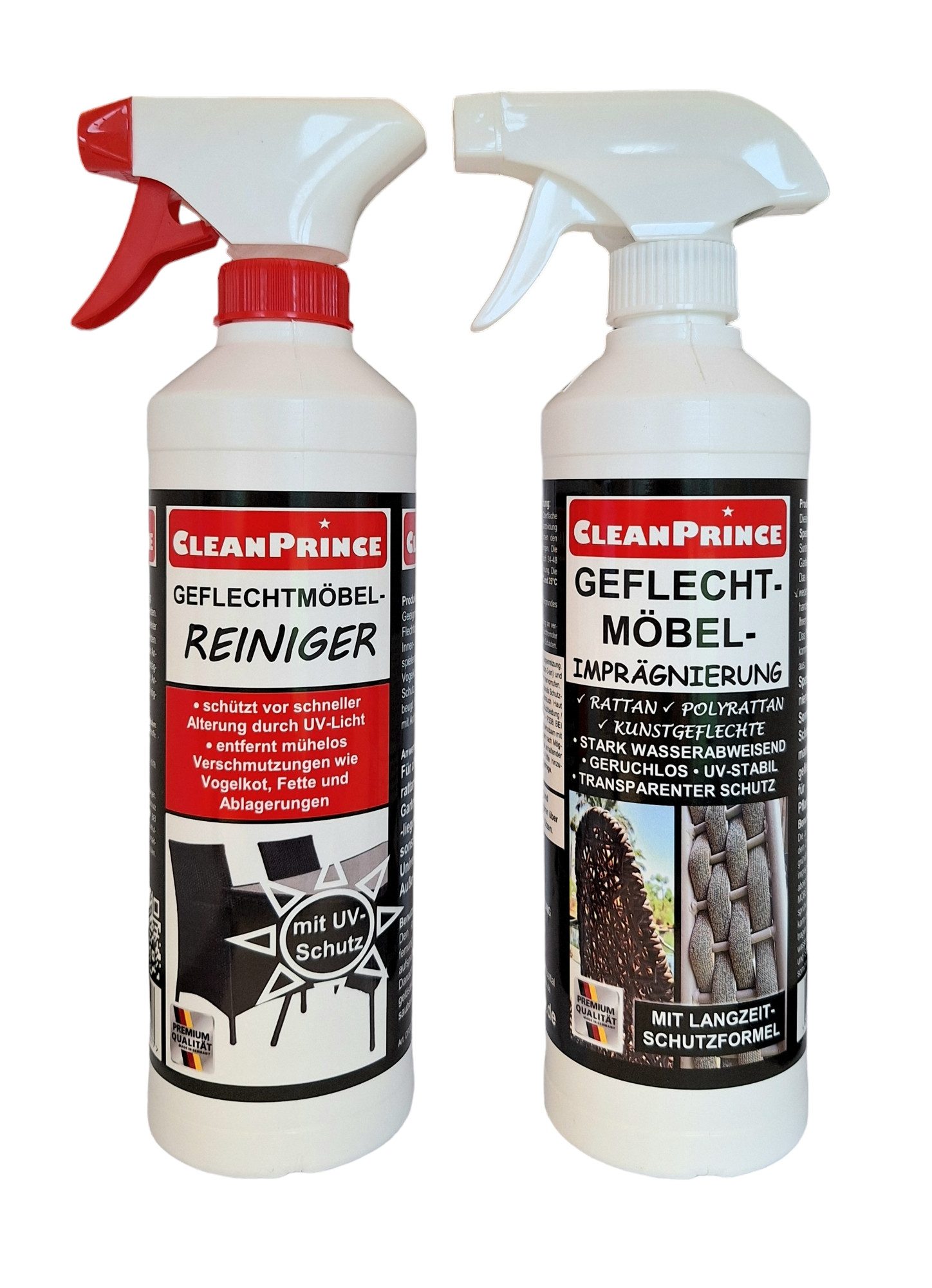 Zubereitungs- und Aufbewahrungshinweise | Imprägnierung: Die zu imprägnierende Oberfläche zunächst mit dem CleanPrince Geflechtmöbelreiniger gründlich reinigen und trocknen lassen. Nicht zu imprägnierende Flächen oder Böden bitte vorher abdecken. Danach die CleanPrince Geflechtmöbel-Imprägnierung gleichmäßig satt aufsprühen und erneut trocknen lassen. Alternativ kann das Mittel auch mit Rolle oder Pinsel aufgetragen werden. Die so behandelte Fläche ist wasserabweisend und schützt gegen Aufquellen und Schwinden. Moose und Grünbeläge finden somit keinen Nährboden mehr. Reiniger: Все Oberflächen aus Polyrattan oder Kunstgeflecht wie Gartentische, -stühle, -bänke, -liegen, Pflanzgefäße und sonstige Gartenmöbel. Universell im Innen- und Außenbereich einsetzbar. Den Reiniger circa aus 25 cm Entfernung auf die zu reinigende Fläche aufsprühen und kurz einwirken lassen. Danach mit Schwamm oder Lappen den gelösten Schmutz aufnehmen und mit sauberem, feuchten Tuch nachwischen. |