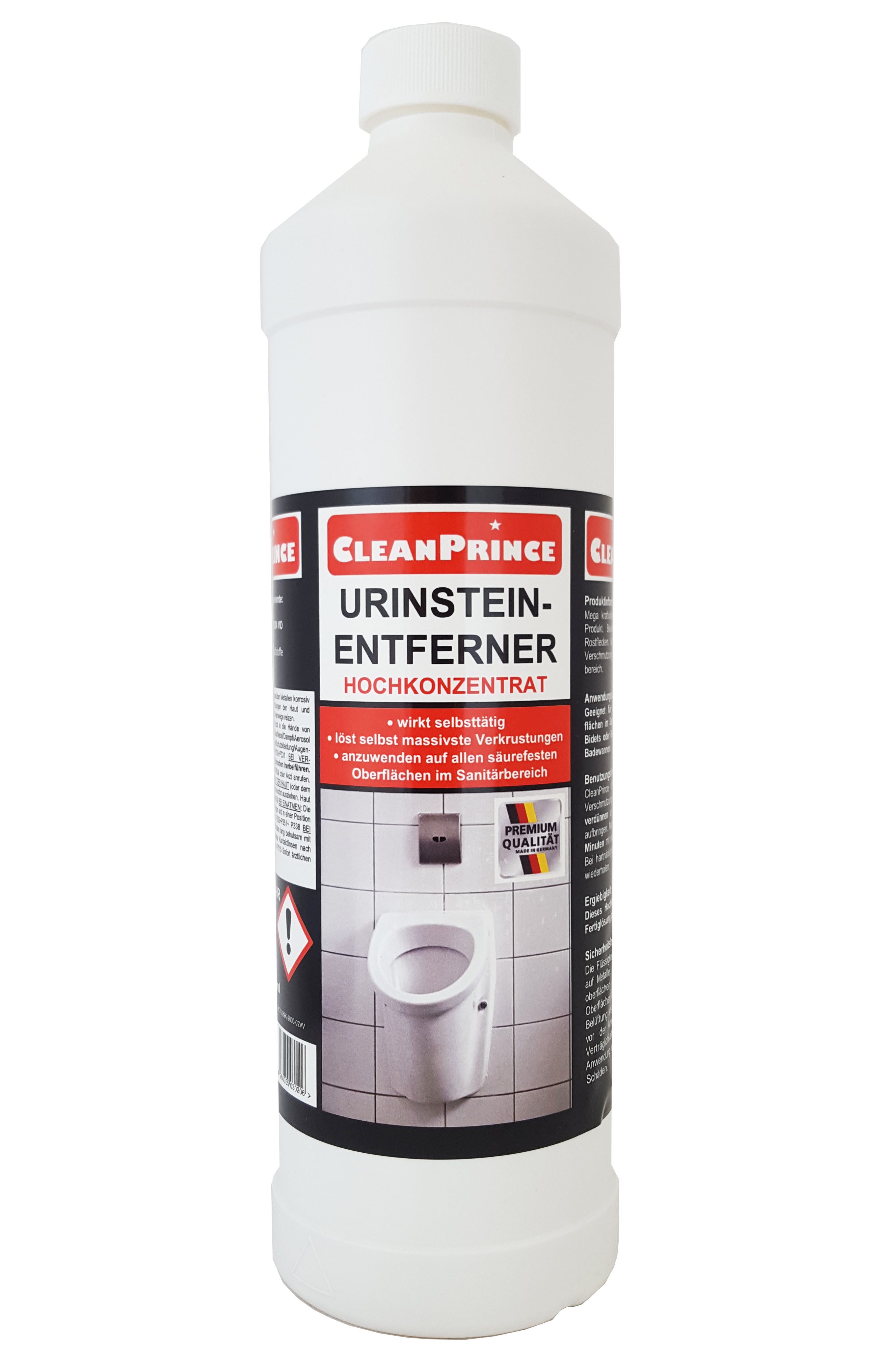 Zubereitungs- und Aufbewahrungshinweise | Geeignet für alle säurefesten Keramikoberflächen im Sanitärbereich wie WC, Urinal, Bidet oder Rinnenanlagen sowie Dusch- und Badewannen. CleanPrince Urinstein-Entferner je nach Verschmutzungsgrad 1:3 oder 1:5 mit Wasser verdünnen und auf die zu reinigende Fläche aufbringen. Nach einer Einwirkzeit von 5-10 Minuten mit reichlich klarem Wasser nachspülen. Bei hartnäckigen Verschmutzungen Vorgang ggfs. wiederholen. Ergiebigkeit dieses Hochkonzentrat ergibt bis zu 30 Liter Применитьlösung Sicherheitshinweise Die Flüssigkeit und deren Dämpfe wirken korrosiv auf Metalle. Produkt nicht anwenden an Chromoberflächen oder anderen säureempfindlichen Oberflächen. Bei der Verwendung für ausreichende Belüftung sorgen. Dieses Produkt ist grundsätzlich vor der Anwendung an verdeckter Stelle auf Verträglichkeit zu prüfen. Bei sachfremder Anwendung erlischt jegliche Haftung für mögliche Schäden. |