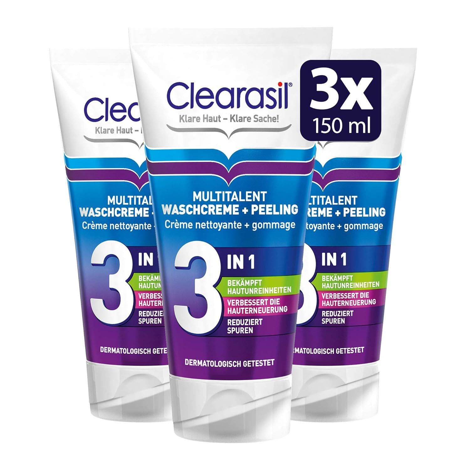 Clearasil 3in1 kombiniert Waschcreme und Gesichtswasser. Somit ist es der ideale Begleiter für alle, die bei der täglichen Gesichtspflege-Routine gerne Zeit sparen. Clearasil Multitalent Waschcreme + Peeling 3in1 wirkt gleich dreifach gegen unreine Haut: Es bekämpft Hautunreinheiten wie Pickel und Mitesser, verbessert die Hauterneuerung und reduziert Mitesser. Das Peeling ist für die tägliche Reinigung im Gesicht geeignet, befreit verstopfte Poren und sorgt für sichtbar reinere Haut.