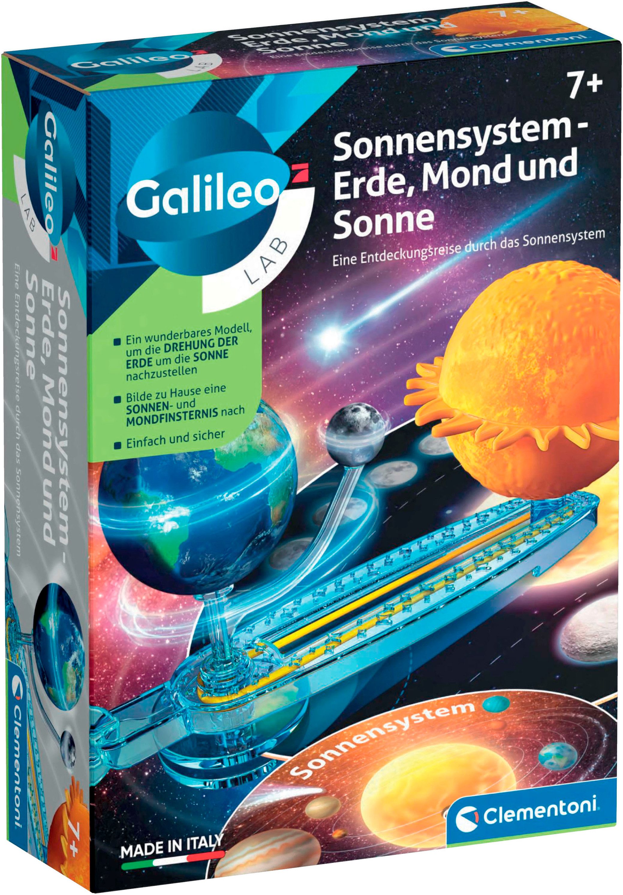 Ausstattung | Achse, Achse mit Stift, Erde, Füsse, Gummibänder, Halterung für die Erde, Kartonscheibe, Riemenscheibe, Saugnäpfe, Sockel, Sonne, Stab mit Lasche, Stern |