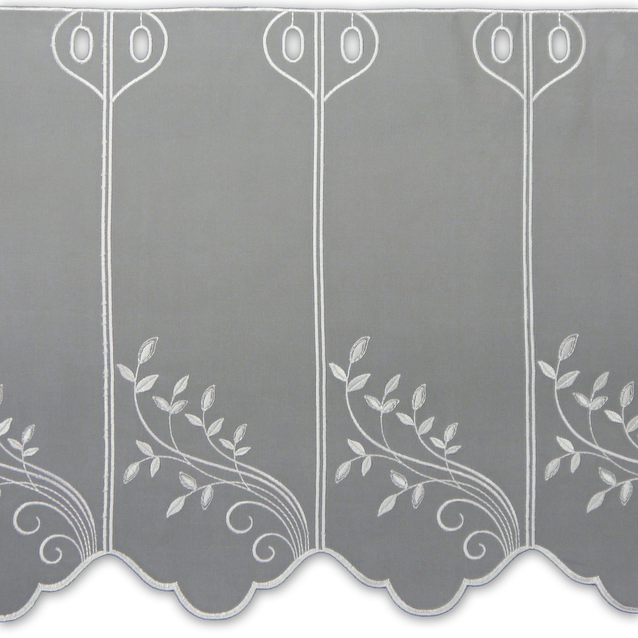 Transparente Scheibengardine in weiße Voile mit Stickerei in Blätter - Ranken in weiß. Das moderne, zeitlose Design mit der fantasievollen Rankenstickerei verleiht jedem Raum eine ansprechende Note. Die umstickten Stablöcher machen das Dekorieren wirklich einfach - Gardine auf die Gardinenstange schieben - fertig! Scheibengardine ist aus weichem und luftigem Stoff. Sehr einfacher Pflegehinweis: 30°C Schonwäsche und bei niedriger Temperatur bügeln.