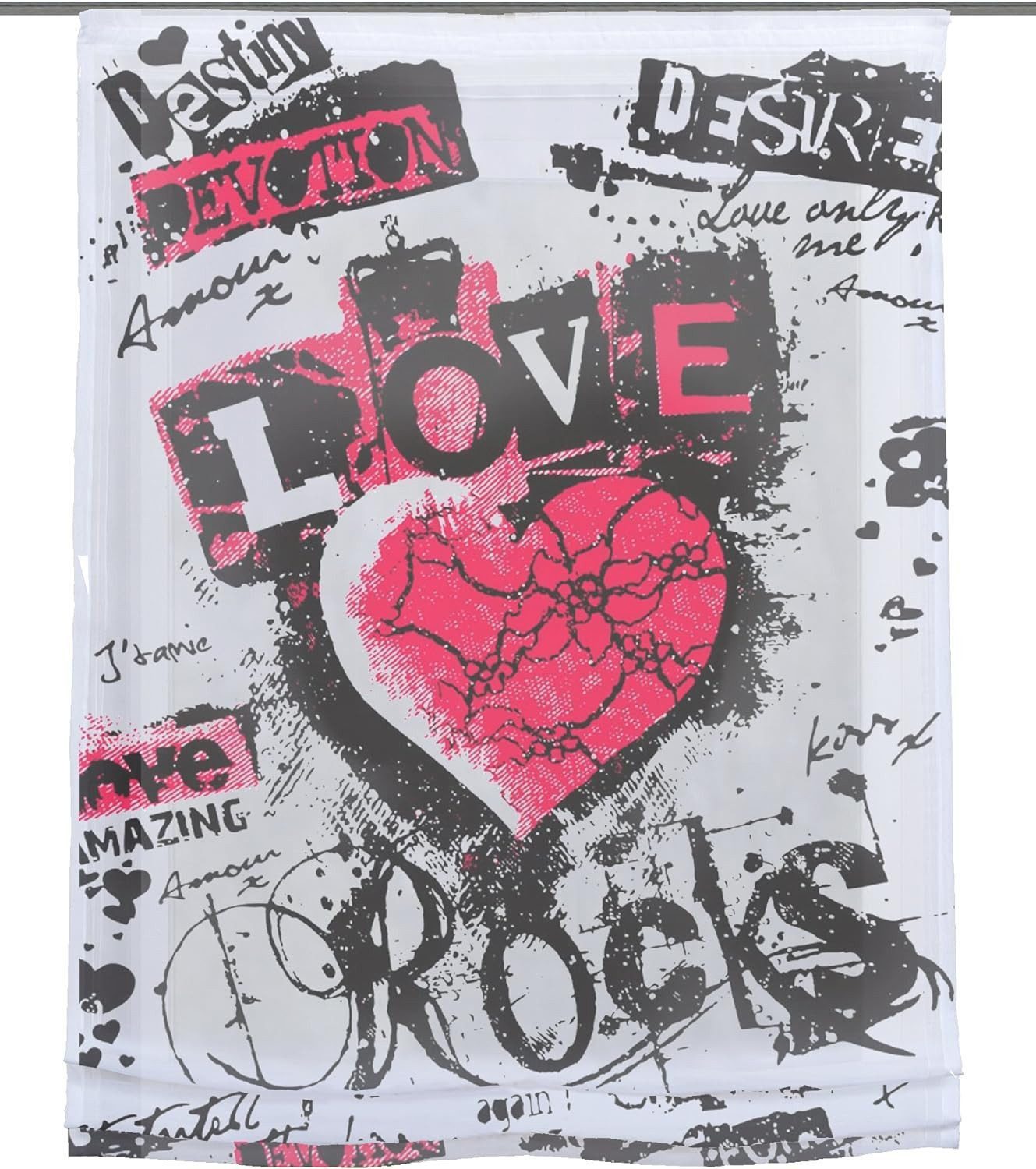 Digital bedrucktes Raffrollo aus transparentem Voile. Der Druck wurde durch eine spezielles Druckverfahren digital auf den Stoff gebracht, wodurch der Druck besonders farbintensiv und hoch qualitativ ist. Durch die einfache Stoppertechnik lässt sich das Rollo kidnerleicht in der Höhe stufenlos verstellen. Das Rollo besteht zu 100% aus Polyester.