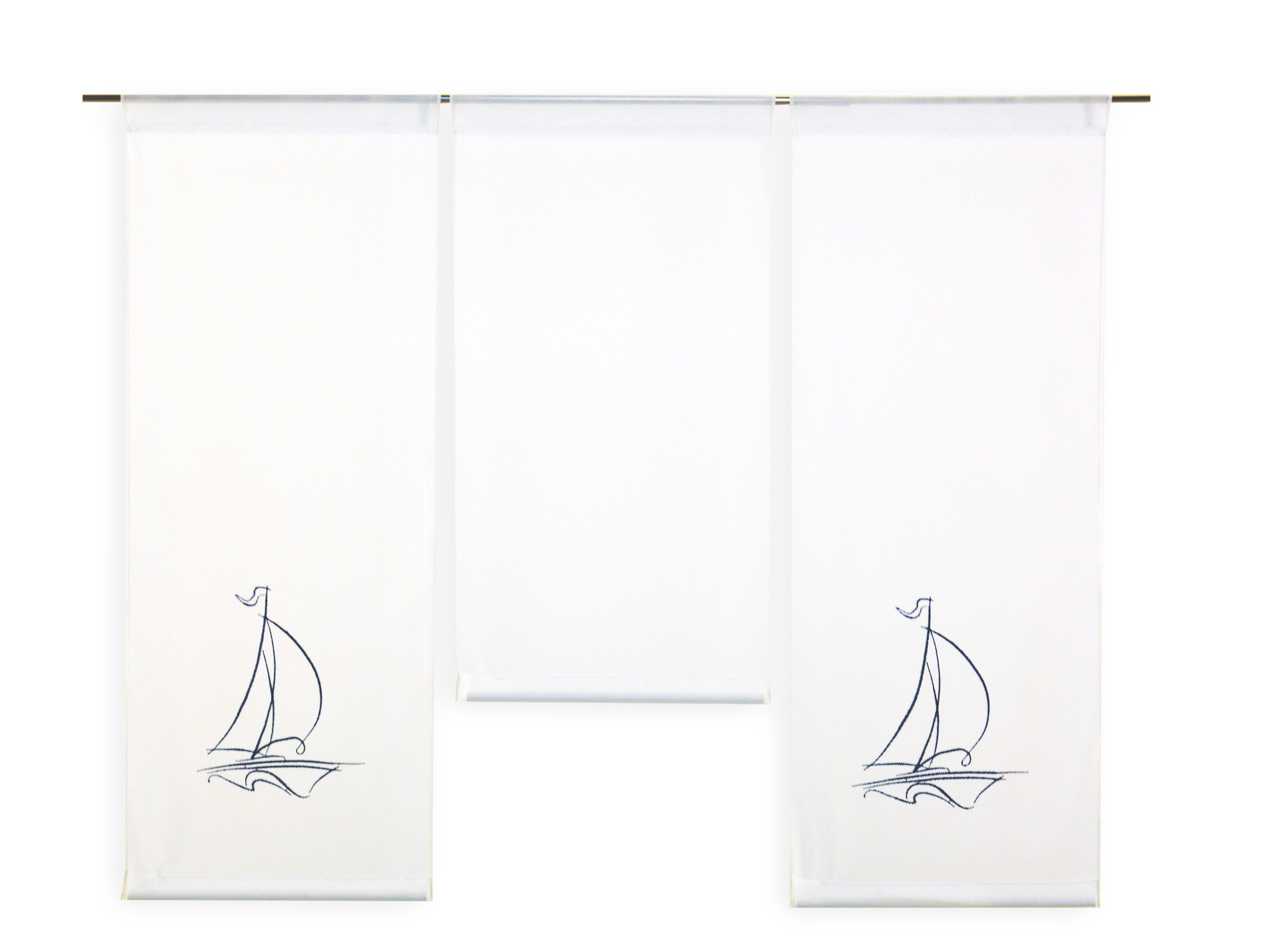Mini Flächenvorhang 3er Set aus weißem Voile mit Effektstruktur bestickt mit blauen Segelboot Motiv. Maße 3er Set Miniflächenvorhang Gesamtbreite 3x 30 cm Длина 80 / 60 / 80 cm. Sehr pflegeleicht, waschbar bei Schonwaschgang 30°, nicht heiß bügeln, nicht im Trockner Die Bistrogardine hat einen Tunnelzug, auch Stangendurchzug genannt, für dünne Stangen bis 12 mm Durchmesser. Die Gardine ist transparent und passt hervorragend als Fensterdekoration zum Beispiel für Einrichtung im maritimen Stil. Die Lieferung ist inkl. Beschwerungsstangen - Diese Scheibengardine ist hochwertig verarbeitet und sofort leicht anzubringen. Die einzelnen Stoffbahnen auf eine dünne Stange bis 12mm Durchmesser oder Vitragenstange schieben und auf die Dekorationsbreite verteilen. Die Bistrogardine ist eine schöne Kombination aus Sichtschutz und geschmackvoller Fensterdekoration. Verleihen Sie Ihrem Fenster eine maritime Note: Dieses hochwertige 3‑teilige Mini Flächenvorhang‑Set überzeugt durch zarten weißen Voile‑Stoff mit feiner Stickerei eines eleganten Segelbootes in Blau. Ideal für Küche, Bad oder kleine Fenster – stilvoll, leicht und lichtdurchlässig.