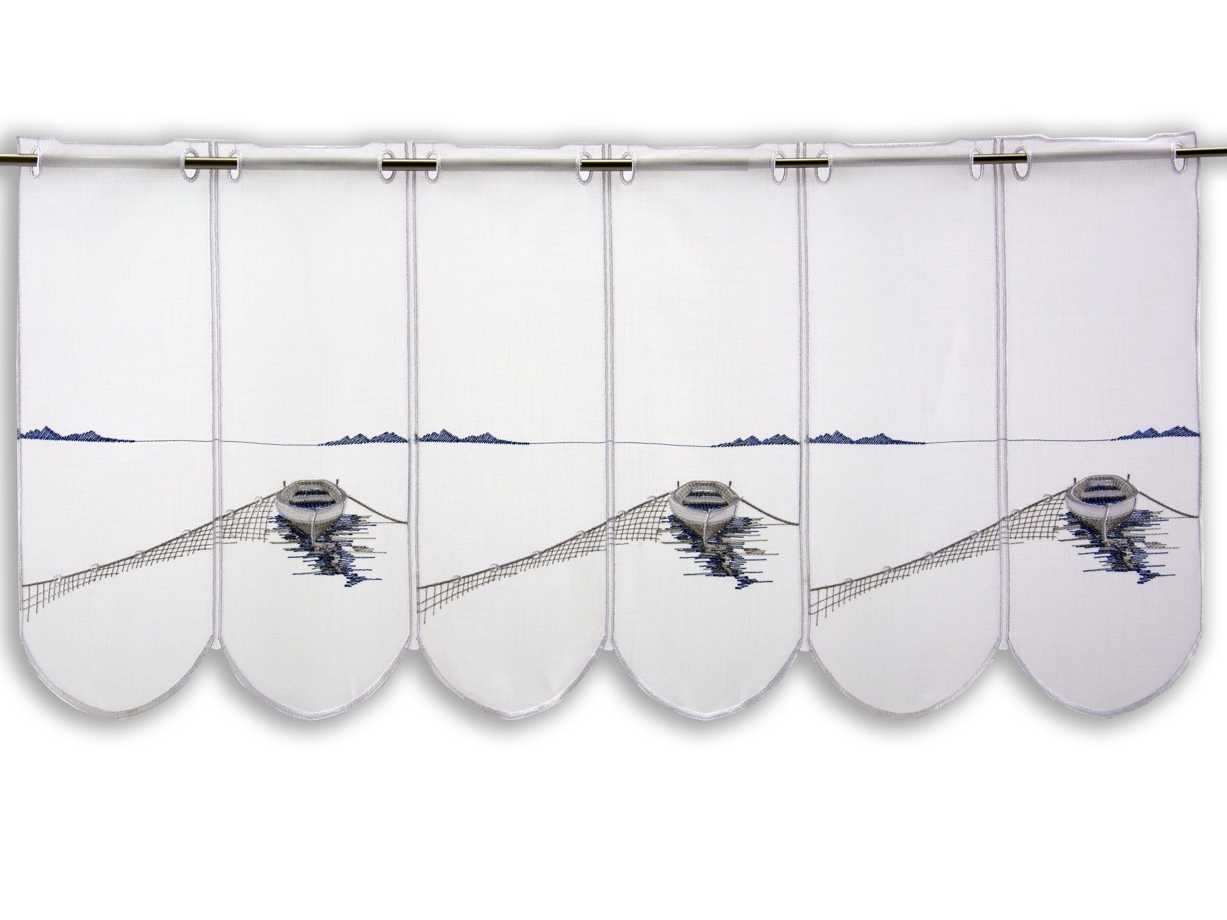 Eine filigran und hochwertig bestickte Scheibengardine mit Fischerboot und Netz |