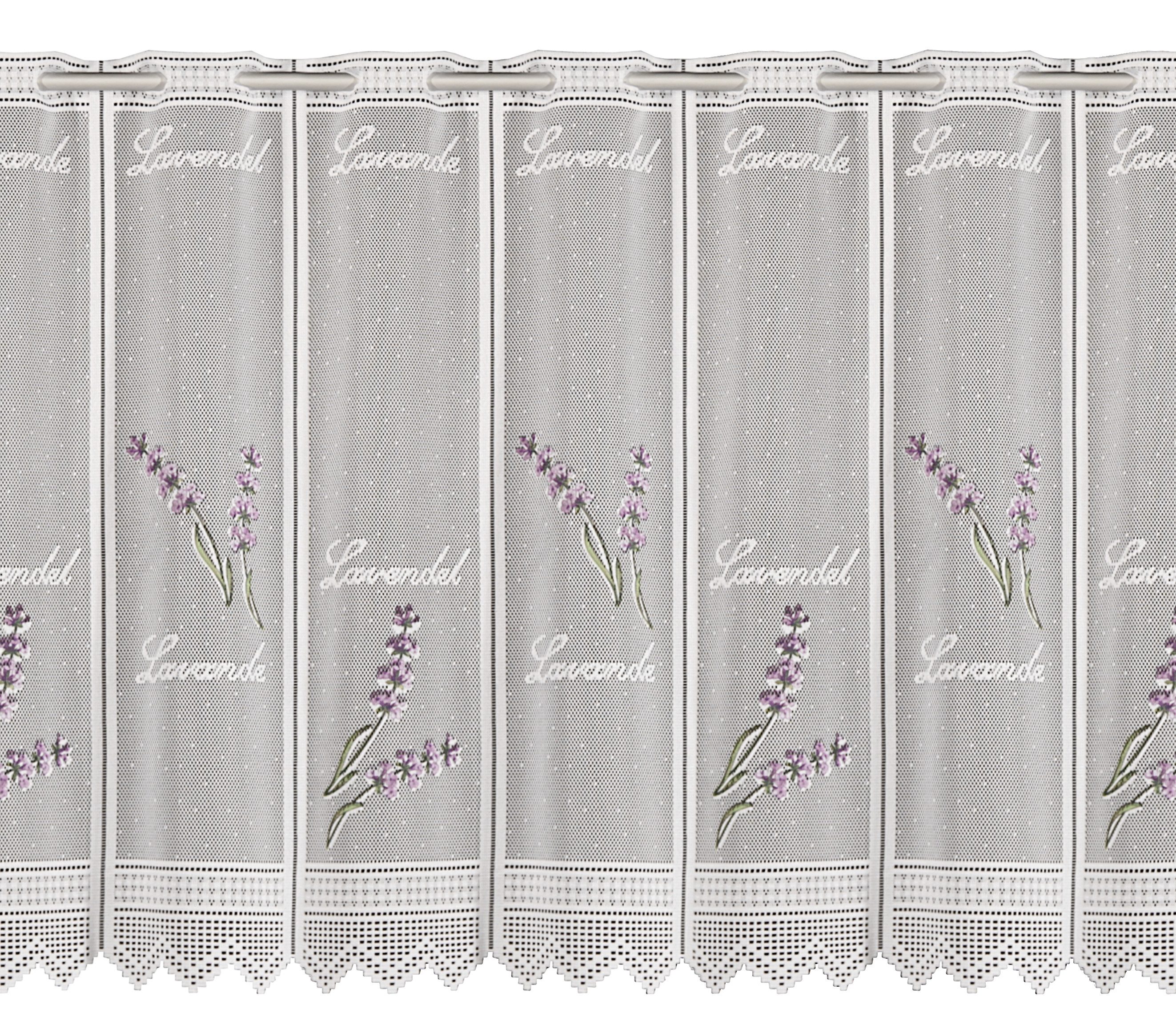 Ein Scheibengardine mit hochwertigen Lavendelmotiv verwandelt ihr Wohnbereich zum Urlaubsort. Das Besondere dieser halbtransparente Bistrogardine sind die über die ganze Fläche verteilten Lavendelmotiv. Diese Scheibengardine im moderne Landhaus Stil ist hochwertig verarbeitet und sofort leicht anzubringen. Einfach auf eine dünne Stange bis 12mm Durchmesser oder Vitragenstange schieben und auf die Dekorationsbreite verteilen. Die Scheibengardine ist eine schöne Kombination aus Sichtschutz und geschmackvoller Fensterdekoration. Robuster transparenter Kurzstore mit Stangenlöcher bestehend aus einem Jaquardstoff. Abschluss mit einem Dreieckabschluß und das Material ist 100% aus Polyester.