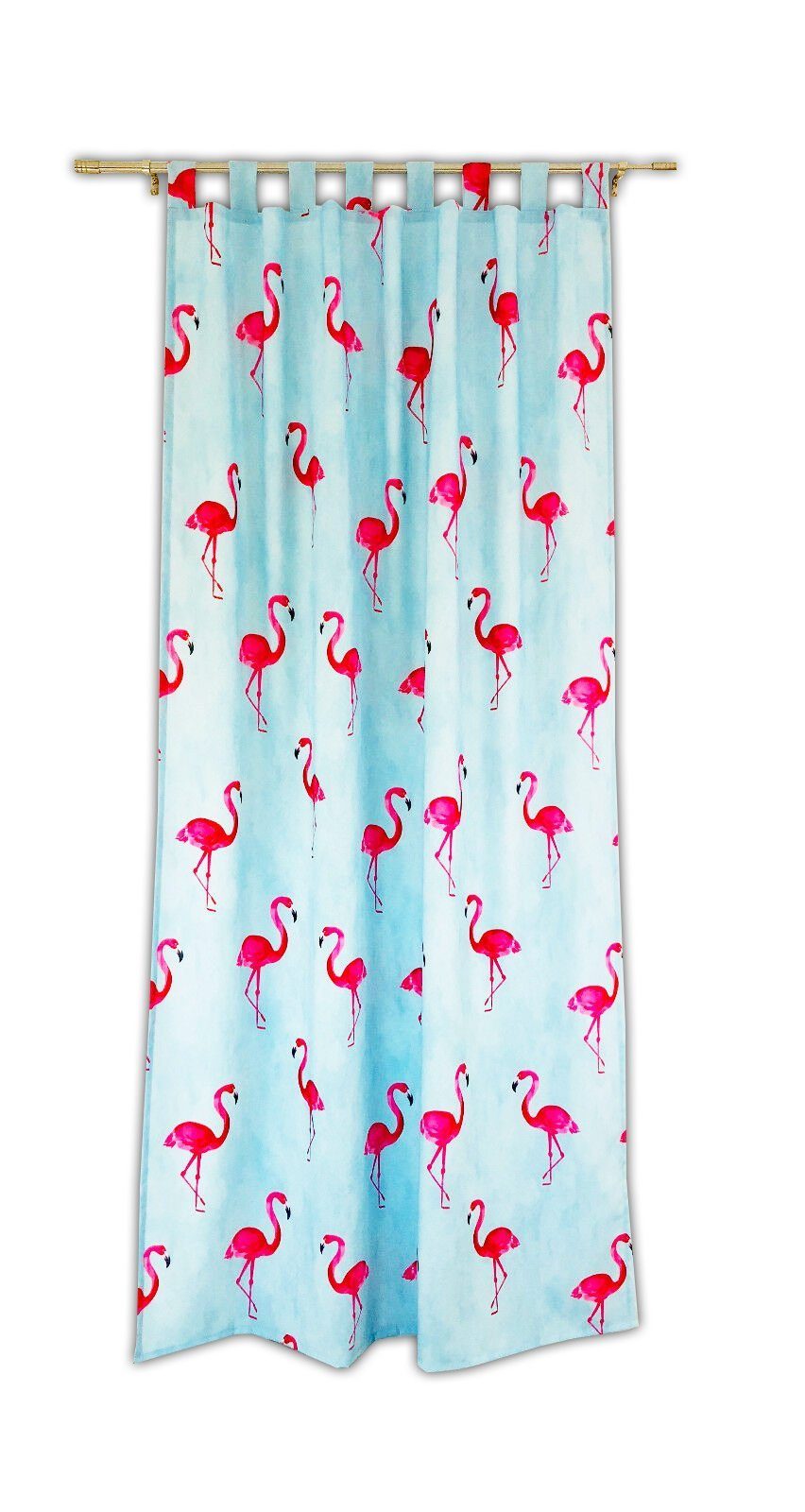 Hochwertig gearbeiteter Schlaufenschal in den Farben hellblau und Pink mit dem Muster Flamingos. Die Rückseite ist nicht bedruckt und weiß, der Druck schimmert jedoch durch. Der Vorhang hat 8 angenähte Schlaufen und außerdem ein angenähtes Gardinenband. Wenn sie das Gardinenband nutzen möchten, können sie die Schlaufen problemlos mit einer Schere abschneiden und dann die Gardine mittels Röllchen oder Aufhängehaken in ihrer Gardinenschiene befestigen. Der Dekoschal ist blickdicht und lässt sich an alle Arten von Stange/Schiene anbringen. Hol dir mit diesem farbenfrohen Vorhang ein bisschen Urlaubsfeeling nach Haus.