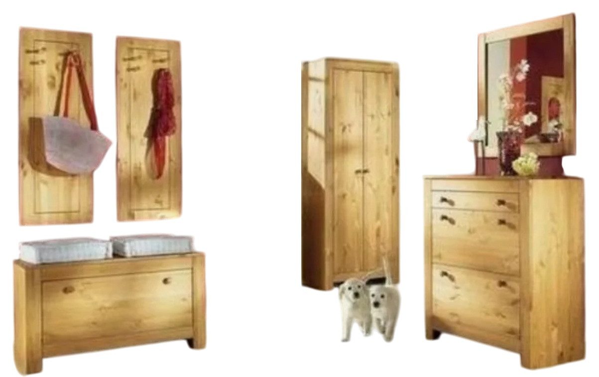 Set beinhaltet | Dielenschrank, Schuhkommode, Schuhtruhe, 2 Wandpaneele und Spiegel |