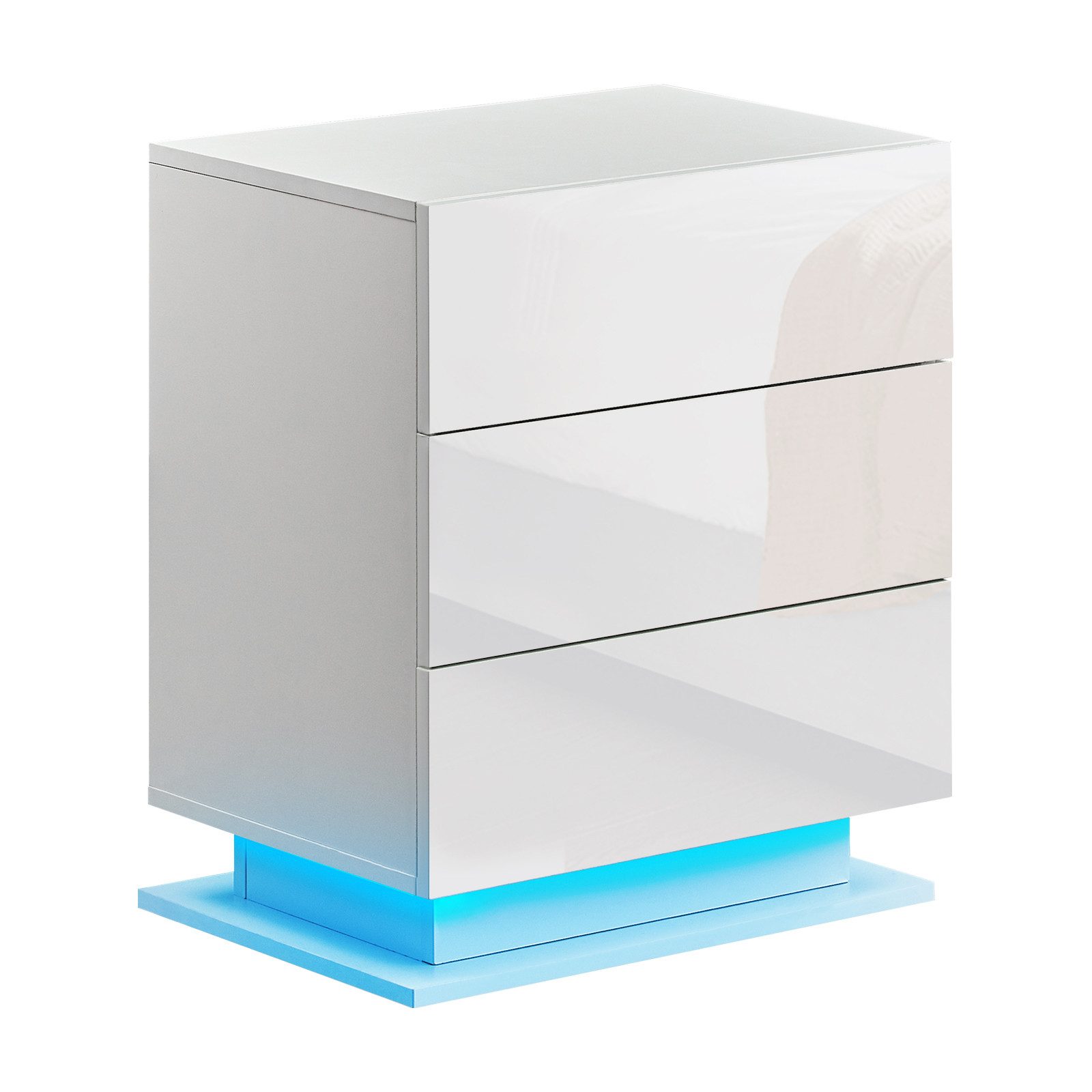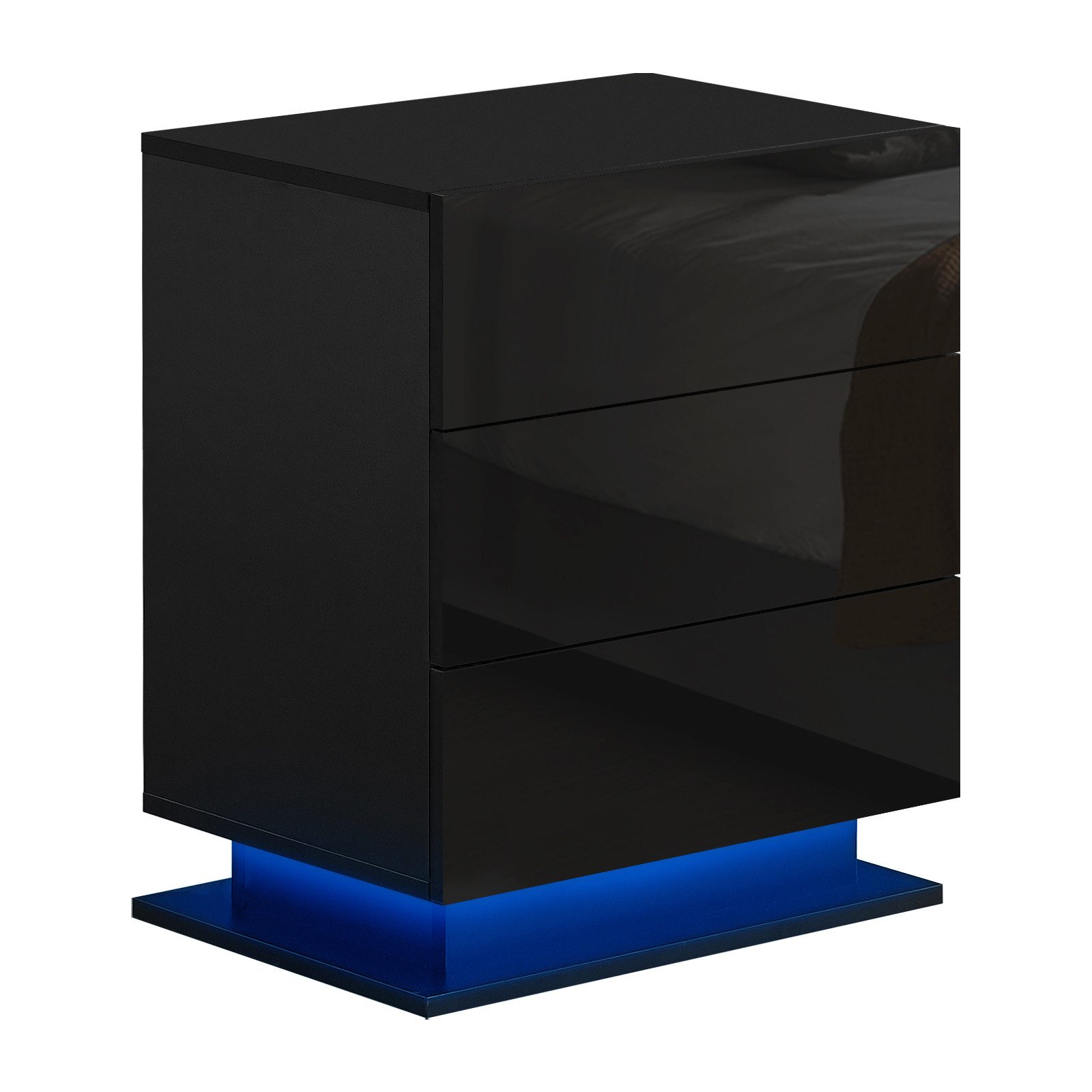 Diese Nachtkommode besteht aus einer 15 mm dicken Spanplatte mit einer hochglänzenden Oberfläche, der Rest ist matt. Der Nachttisch ist mit einer LED-Lichtleiste ausgestattet. Die Farbe der Leiste wird über eine Bluetooth-Fernbedienung eingestellt und kann in verschiedenen Farben geändert werden.