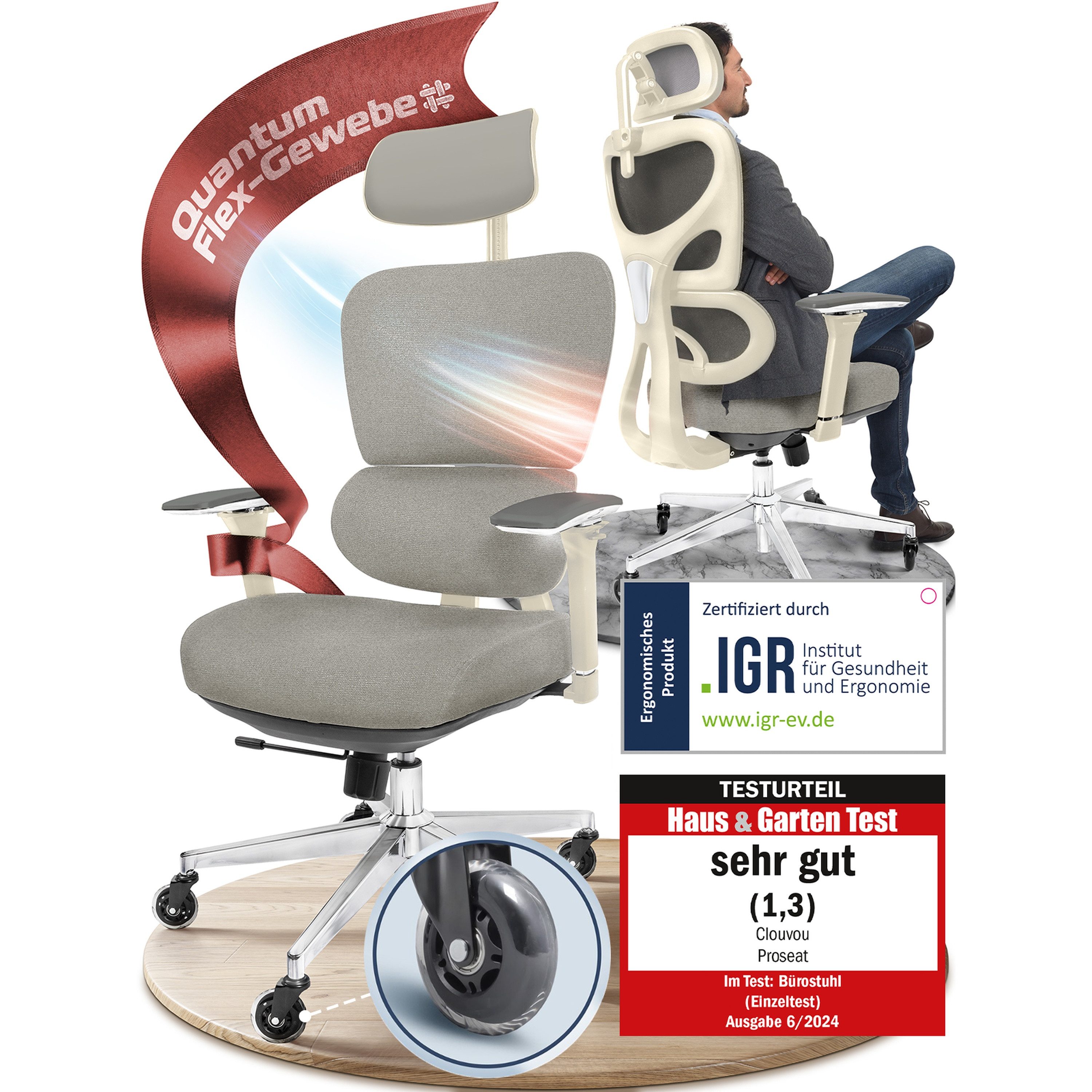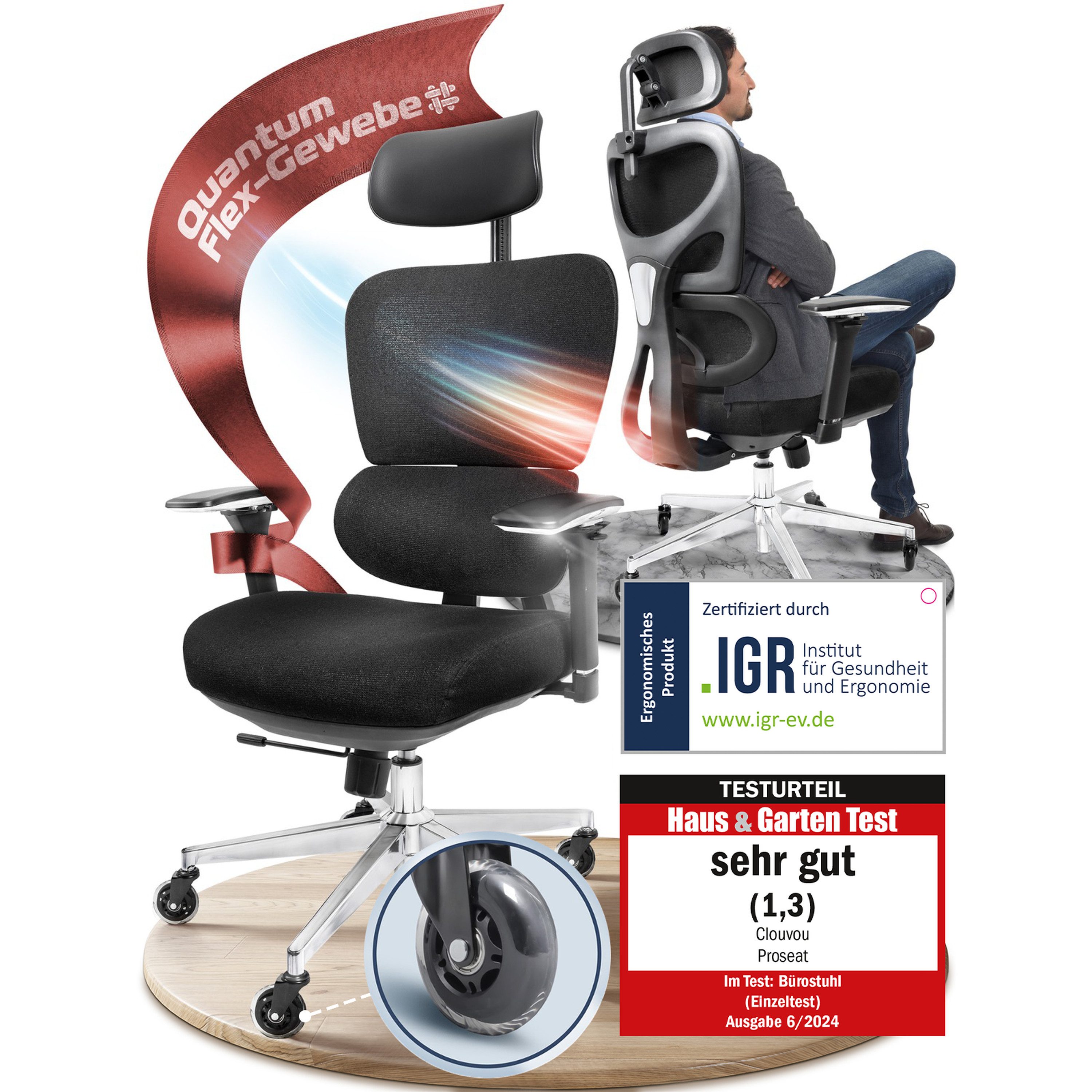 Dieser ergonomische Bürostuhl bietet erstklassigen Komfort und gesundes Sitzen für lange Arbeitstage. Mit einem robusten Rahmen aus Chrom-Metall und einem exklusiven QuantumFlex-Gewebe sorgt er für Langlebigkeit und Unterstützung der Rückengesundheit. Das thermoregulierende QuantumFlex-Gewebe an Rückenlehne und Sitzfläche passt sich jeder Jahreszeit an, indem es im Winter wärmt und im Sommer kühlt – ideal für den ganzjährigen Einsatz im Büro oder Home Office.