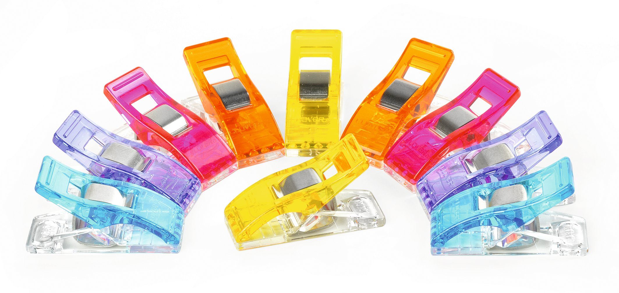 Die Packung enthält 10 Stoffklammern. Diese sind farbenfroh, fallen somit auf der Näharbeit auf. Vor allem aber sind sie wie von Clover gewohnt hochwertig hergestellt und somit präzise einsetzbar.