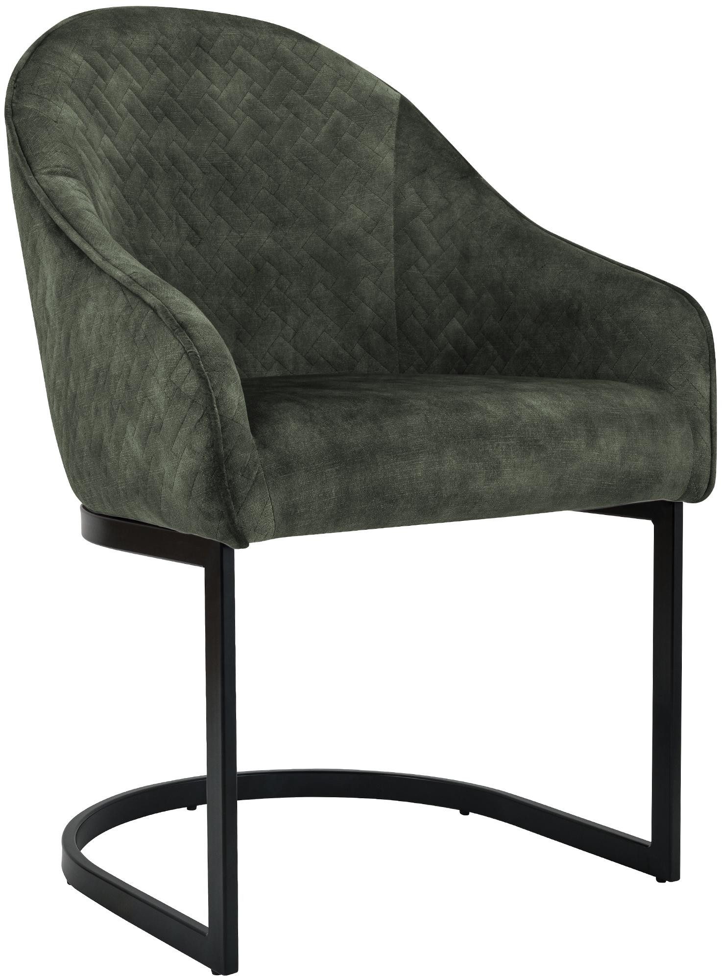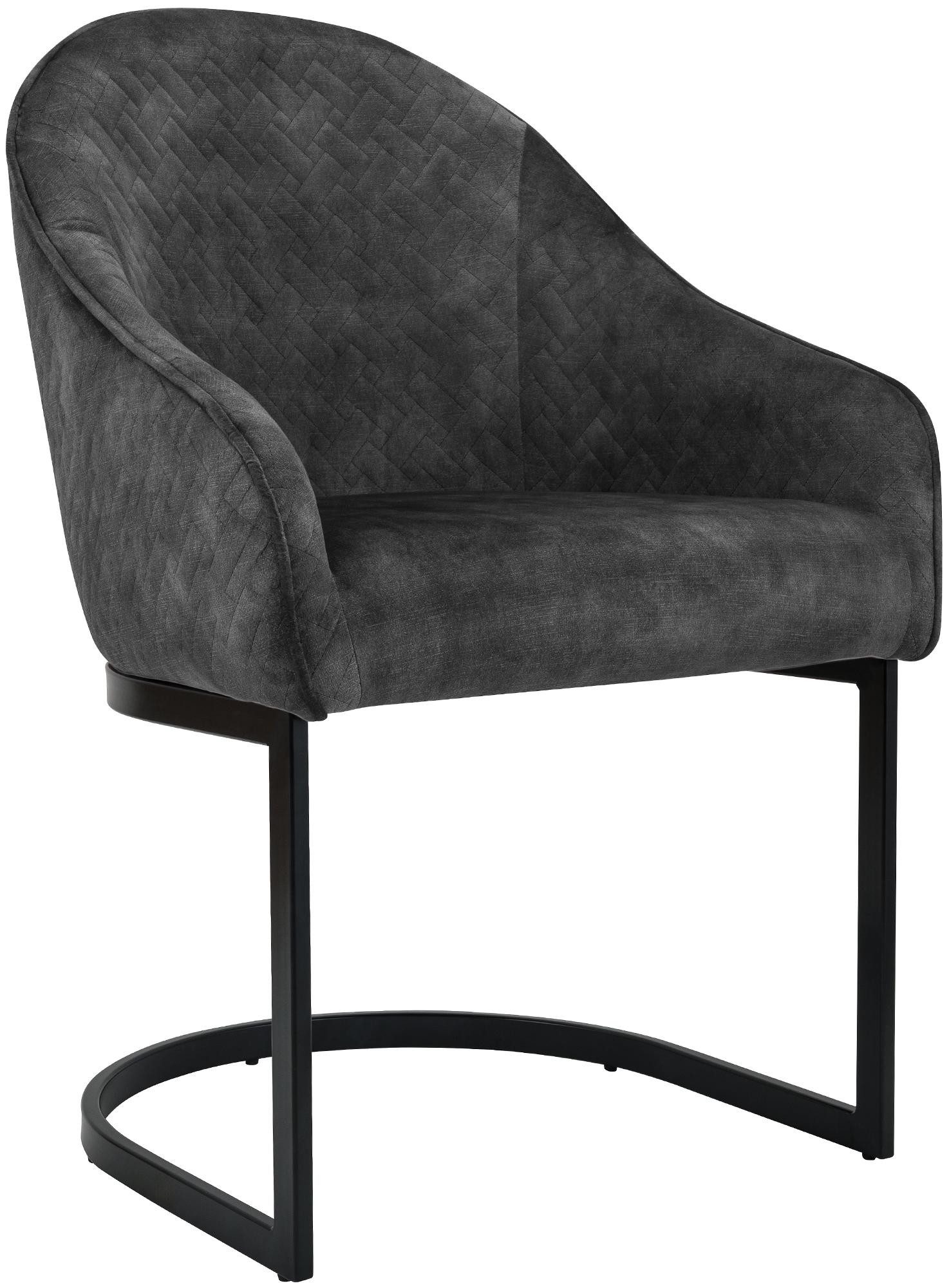 Das pulverbeschichtete Freischwinger-Gestell aus schwarzem Stahl sorgt für Stabilität und einen leichten Schwung beim Sitzen.