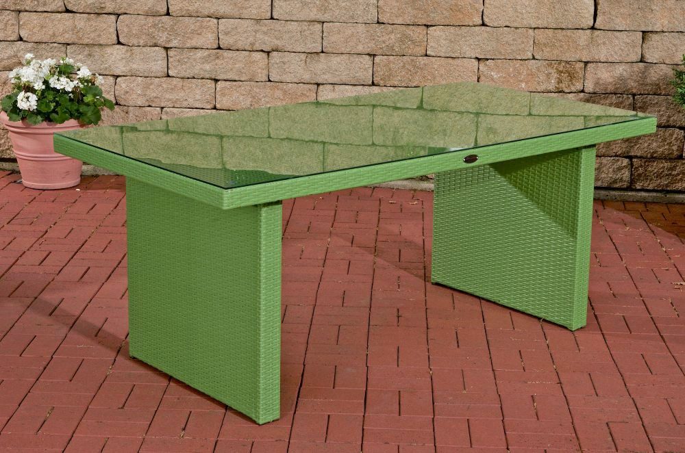 Die aus Polyrattan geflochtene aufwendig verarbeitete Tischplatte bietet viel Platz für Kulinarisches. Sie ist mit einer seitlich etwas abgerundeten 5mm dicken Glasplatte ausgestattet, die sehr edel aussieht. Sie wird von transparenten Gumminoppen rutschsicher getragen und liegt dadurch nicht direkt auf dem Geflecht. Die zwei Tischbeine sorgen nicht nur für eine hohe Stabilität, sondern auch für angenehme Beinfreiheit unter dem Tisch. Dieser Polyrattantisch ist ein echter Hingucker.
