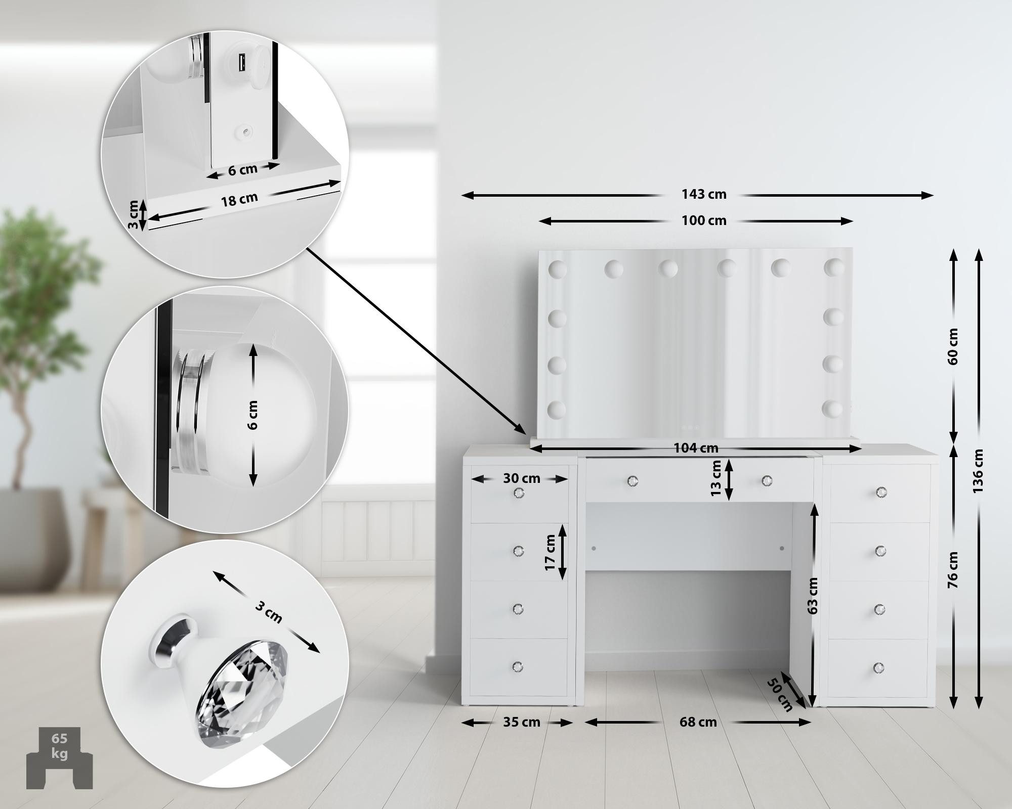 Details: Gesamthöhe: 136 cm Gesamtbreite: 143 cm Gesamttiefe: 50 cm Breite mittleres Modul: 68 cm Breite äußere Module jeweils: 35 cm Höhe Tischplatte: 76 cm Höhe Unterkante mittlerer Schublade: 63 cm Maße Tischplatte (B x T): 143 x 32 cm Maße Spiegel (B x H): 100 x 60 cm Gewicht: 65 kg Leistungsaufnahme: 12V 2A Ausgangsleistung: 100-240V 50/60HZ USB-Anschlüsse: USB-Type A