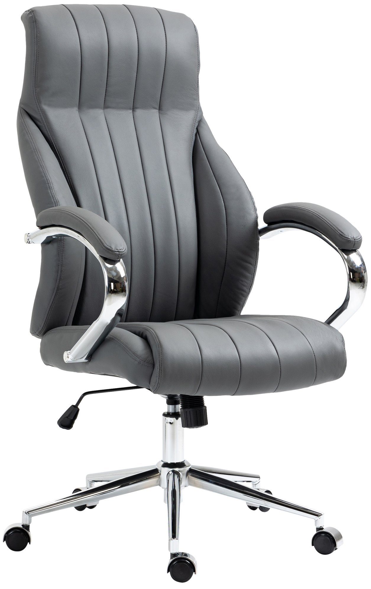 Dieser exklusive Bürostuhl überzeugt nicht nur mit seinem modernen Look, auch in Sachen Komfort kann ihm keiner etwas vormachen. Seine hochwertige Polsterung sorgt für ein angenehmes Sitzgefühl über mehrere Stunden hinweg. Für den Bezug des Sitzes und der Rückenlehne wurde hochwertiges Rindsleder verwendet. Die Rückenlehne hat eine angenehme S-Form und die Sitzhöhe ist stufenlos verstellbar und garantiert ein ergonomisches Sitzen. Des Впередen ist der Schreibtischstuhl mit einem Wippmechanismus versehen, der für mehr Bewegungsfreiheit sorgt. Die Stabilität ist durch das Metallgestell in Chromoptik gewährleistet. Durch die fünf Leichtlaufrollen kann man leicht und locker über den Boden rollen - egal ob auf Hart- oder Teppichböden.