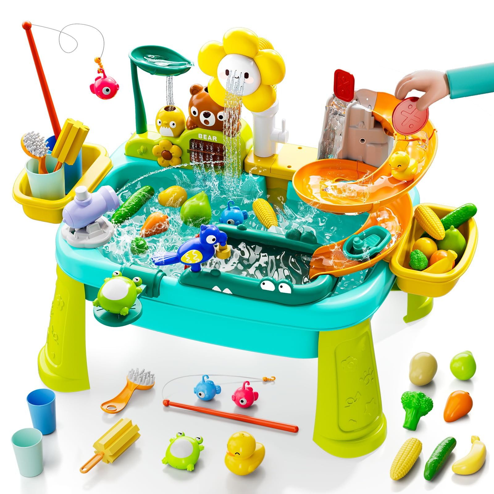 Multifunktionaler Wasserpark: Dieses verbesserte 4-in-1-Wasserbecken mit abnehmbaren Beinen und Wasserdurchflussmechanismus ist ein toller Wasserpark für Kinder. Es kann als Steh- oder Tischspielplatz genutzt werden. Es bietet Küchenspiele, Poolspiele und eine magnetische Angelfunktion. Kinder können mit Magneten Fische, Enten und Boote die Rutsche hinunterbewegen, und es gibt auch ein Sprungbrett. Perfekt für Küchen- und Wasserspielbegeisterte.