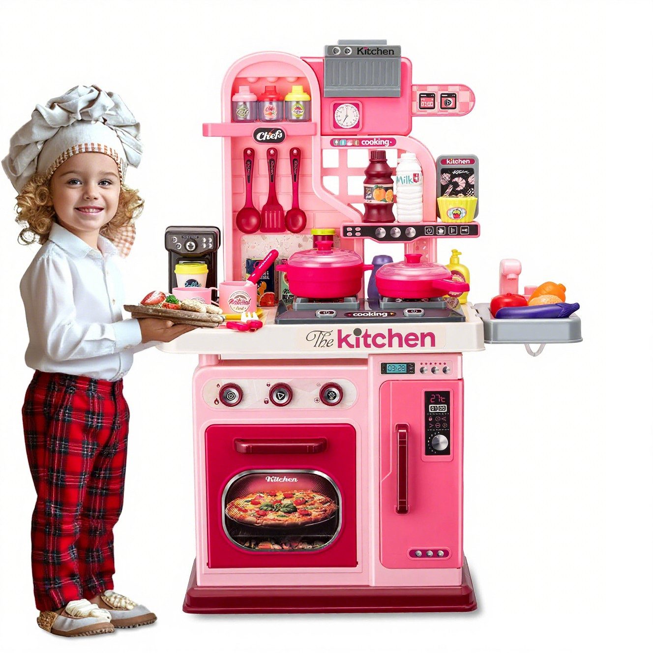 Küchenset: Dieses Kinderküchenset enthält verschiedene Küchenspielzeuge, darunter eine Multifunktionsspüle mit fließendem Wasser, einen Herd, einen Backofen, ein Kochfeld, eine Kaffeemaschine, Spielzeuglebensmittel und weiteres Zubehör. Passende Aufkleber machen das Set noch realistischer.