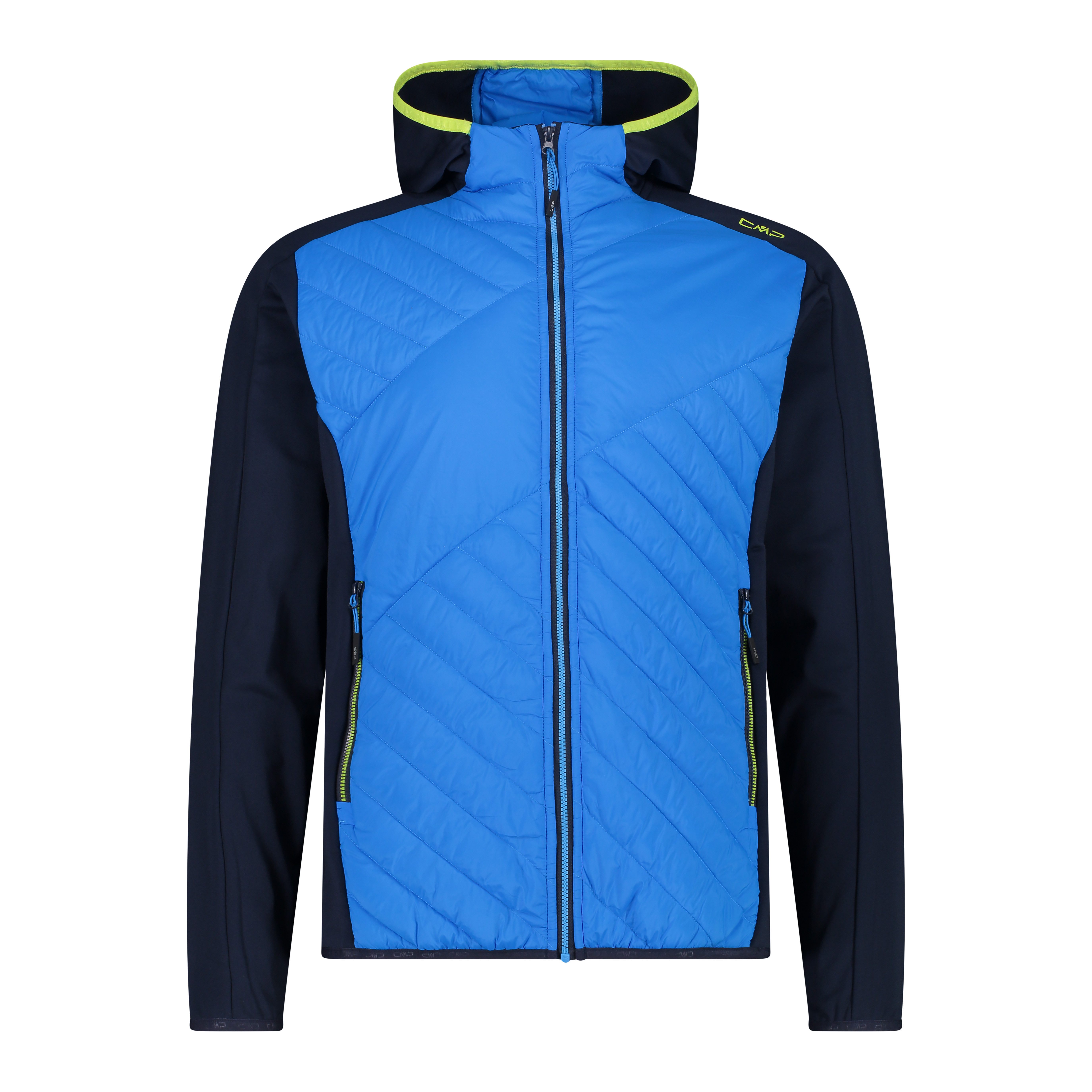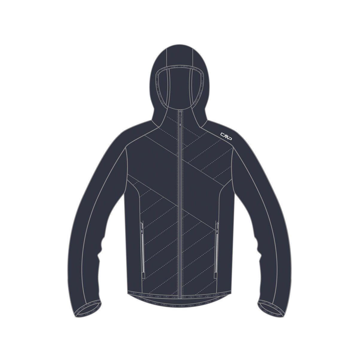 CMP Herren Jacke Man Hybrid Jacket Fix Hood. Hybrid Jacke aus der Kollektion Unlimitech für alle, die leidenschaftlich Trekking- und Wandertouren machen oder schnell wandern und bergsteigen. Seine Vielseitigkeit macht dieses Modell zu einem Kleidungsstück, das sowohl als Außenschicht als auch als Midlayer mit einer Shelljacke getragen werden kann, wenn die Temperaturen sinken. Das Modell verfügt über eine Kombination aus Bereichen aus Feel Warm Flat, einer Wattierung mit geringem Volumen, die auch bei Nässe warm hält, sowie Bereichen aus Stretch-Performance-Gewebe und leichtem gewachstem Polyester, die an den Stellen zum Einsatz kommen, wo maximale Bewegungsfreiheit gefordert ist. Die ergonomische und körperbetonte Passform wird durch elastische Bündchen und Taille verbessert. Der Frontreißverschluss mit innenliegender Windschutzleiste mit Reibeschutz garantiert zusätzlichen Schutz vor Kälte. Die Farben im Color-Block-Muster sorgen für ein fröhliches Motiv und unterstreichen die verschiedenen verwendeten Materialien. Das Modell wird von reflektierenden Details und zwei Seitentaschen abgerundet. Material: 100% Polyamid.